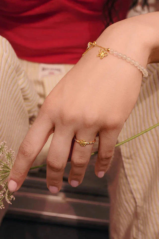 Bracelet de Maanesten avec des perles claires et une chaîne dorée. Le design présente un petit papillon comme symbole près du fermoir.