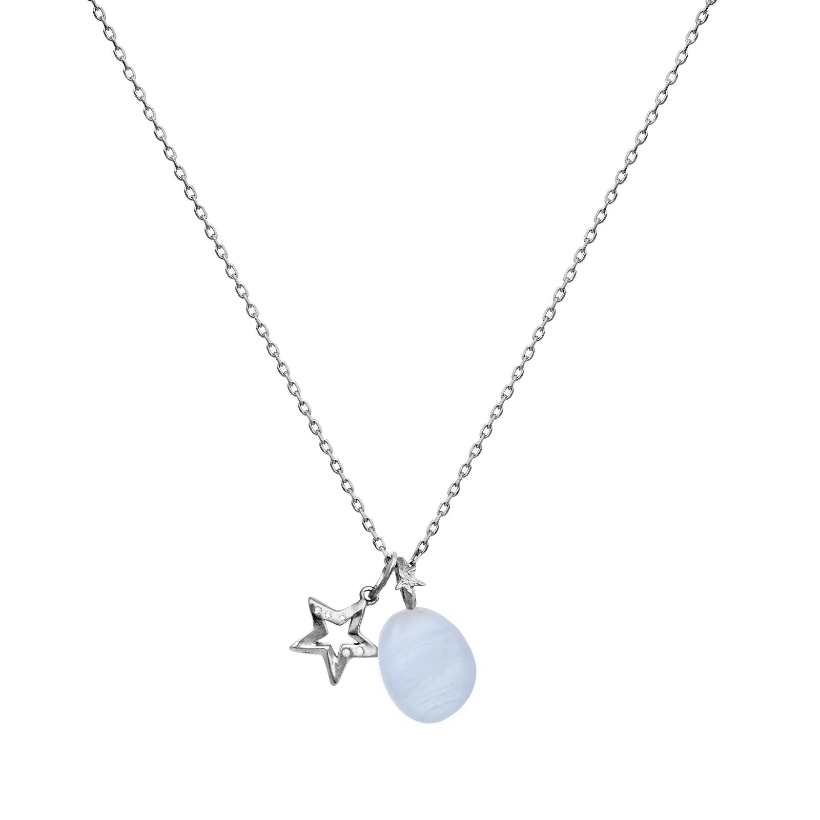 Pendentif de Maanesten avec une pierre bleu clair et un détail en forme d’étoile en argent. Le pendentif est fabriqué en argent sterling 925 recyclé.