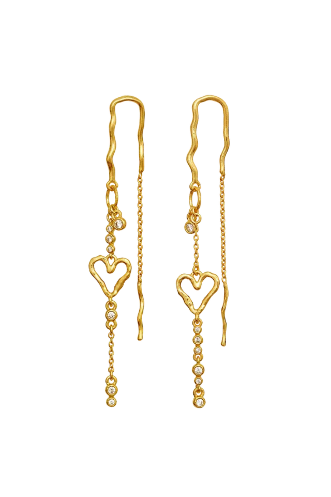 Boucles d’oreilles Maanesten, fabriquées en argent sterling recyclé plaqué or 18 carats. Les boucles d’oreilles sont ornées de zircones blanches dans une silhouette élancée.