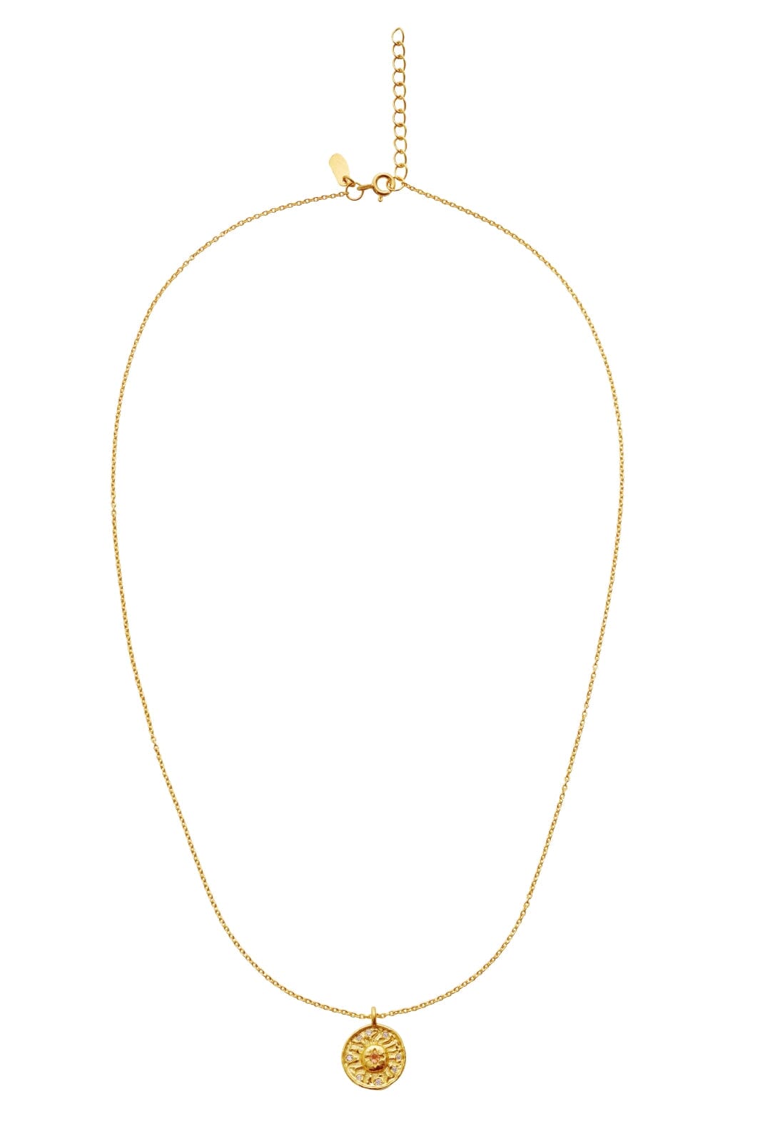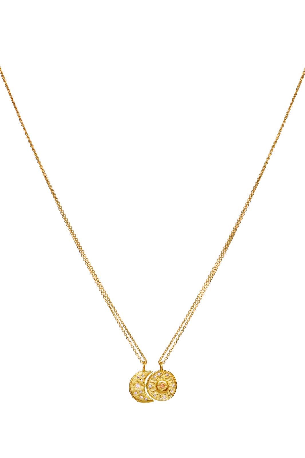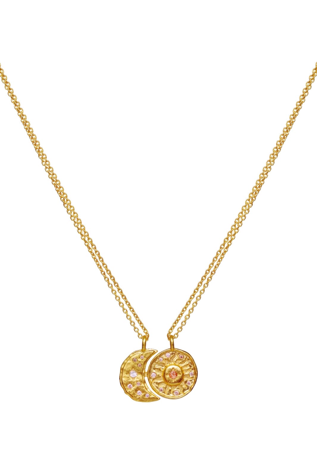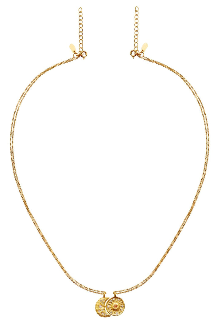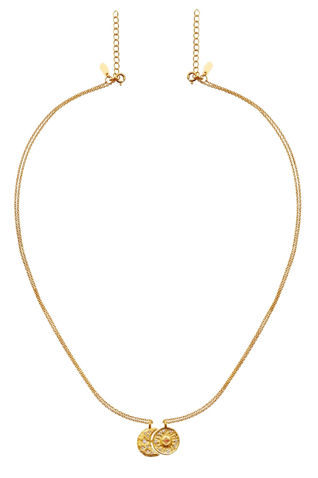 Collier plaqué or de Maanesten avec des motifs de soleil et de lune. Les pendentifs sont décorés de petites pierres et ont un design caractéristique avec des symboles célestes.