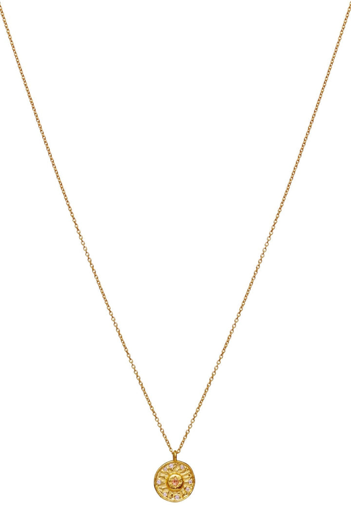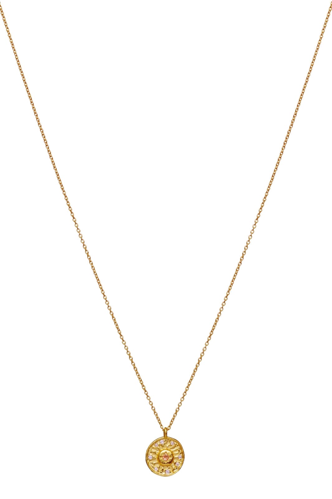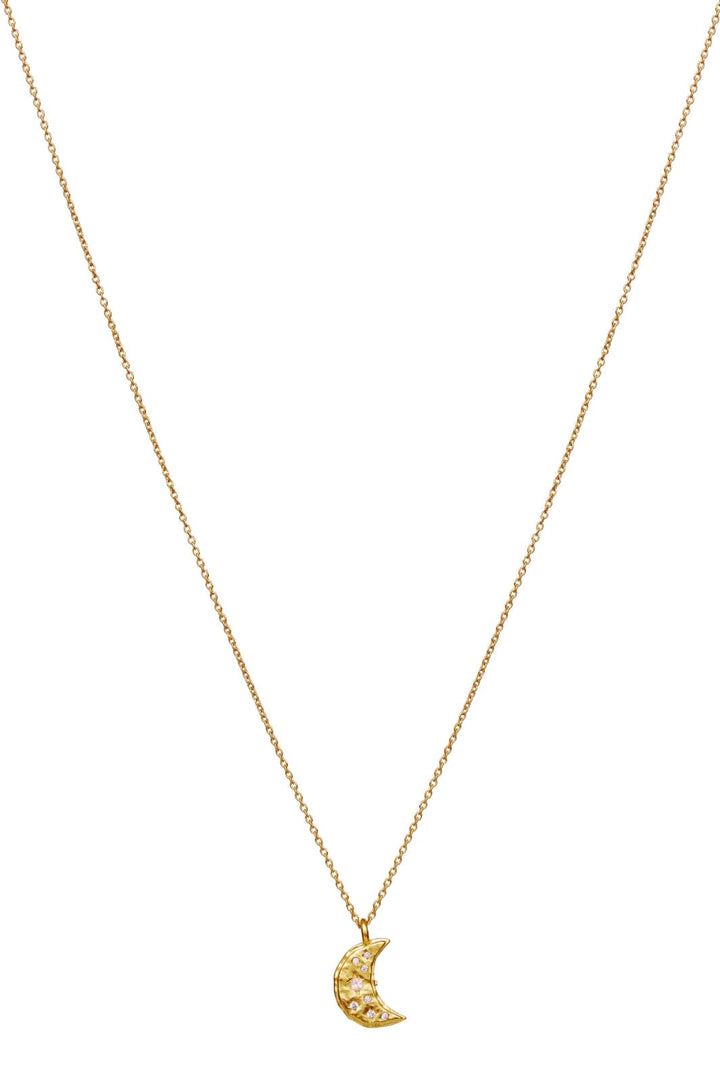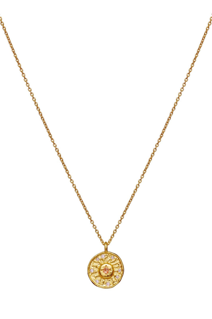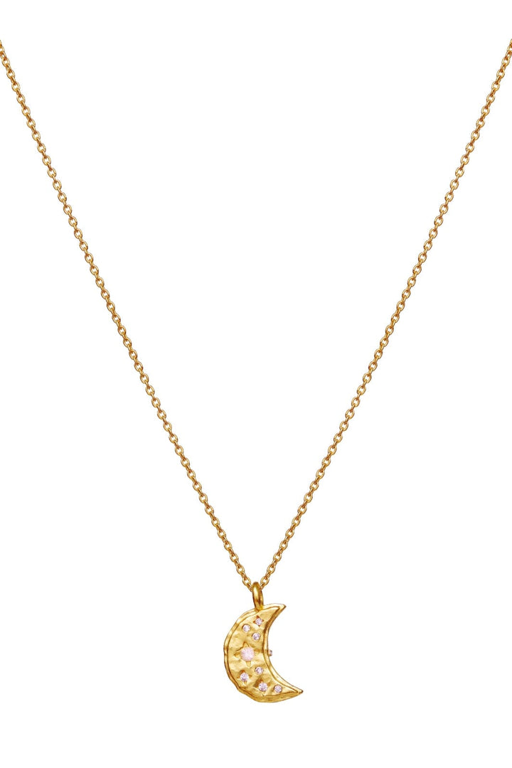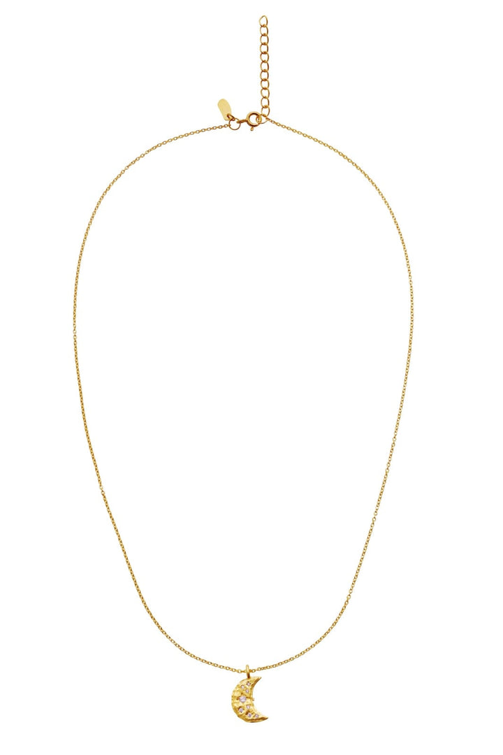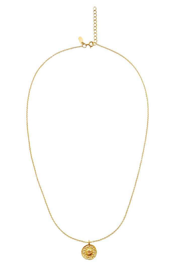 Collier plaqué or de Maanesten avec des motifs de soleil et de lune. Les pendentifs sont décorés de petites pierres et ont un design caractéristique avec des symboles célestes.