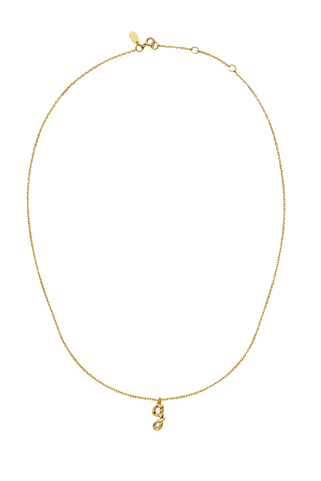 Collier plaqué or de Maanesten avec un pendentif en forme de G. Le collier est fabriqué en argent sterling recyclé avec un plaquage en or 18 carats et présente de petits détails décoratifs sur le pendentif.