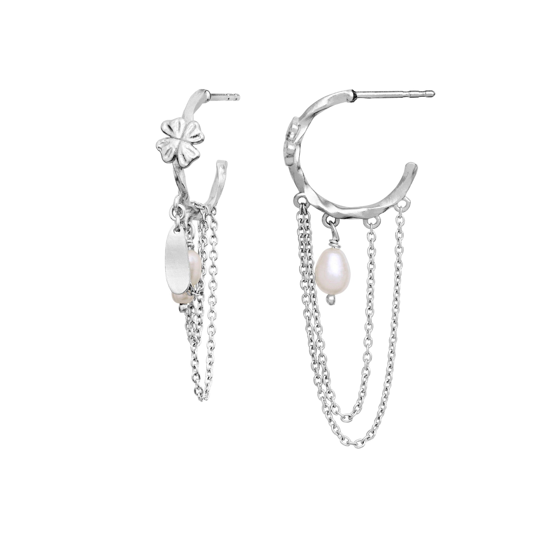 Boucles d’oreilles Maanesten avec motif floral et plusieurs chaînes. Le design associe de l’argent sterling recyclé à des perles d’eau douce de couleur argentée.