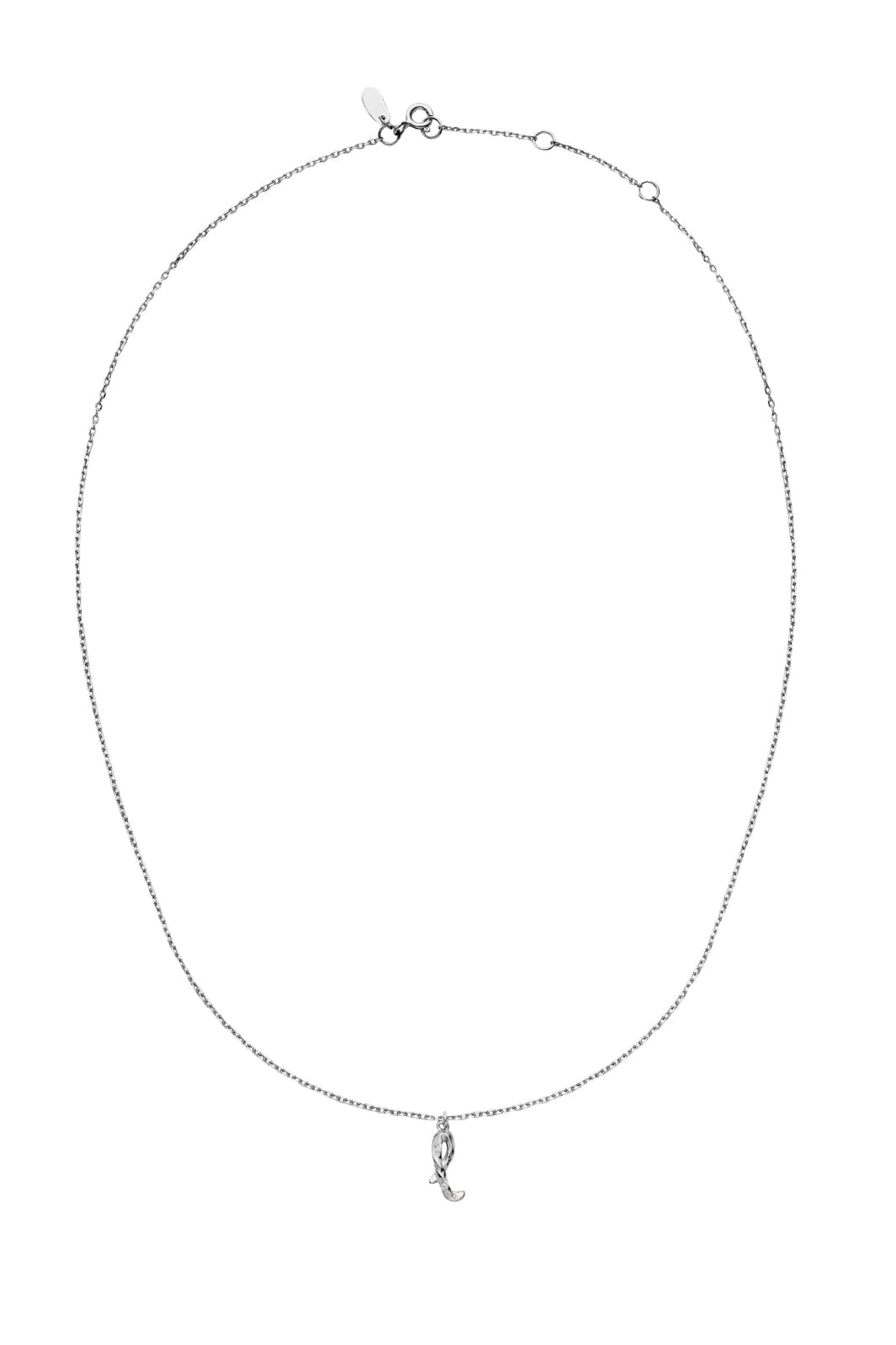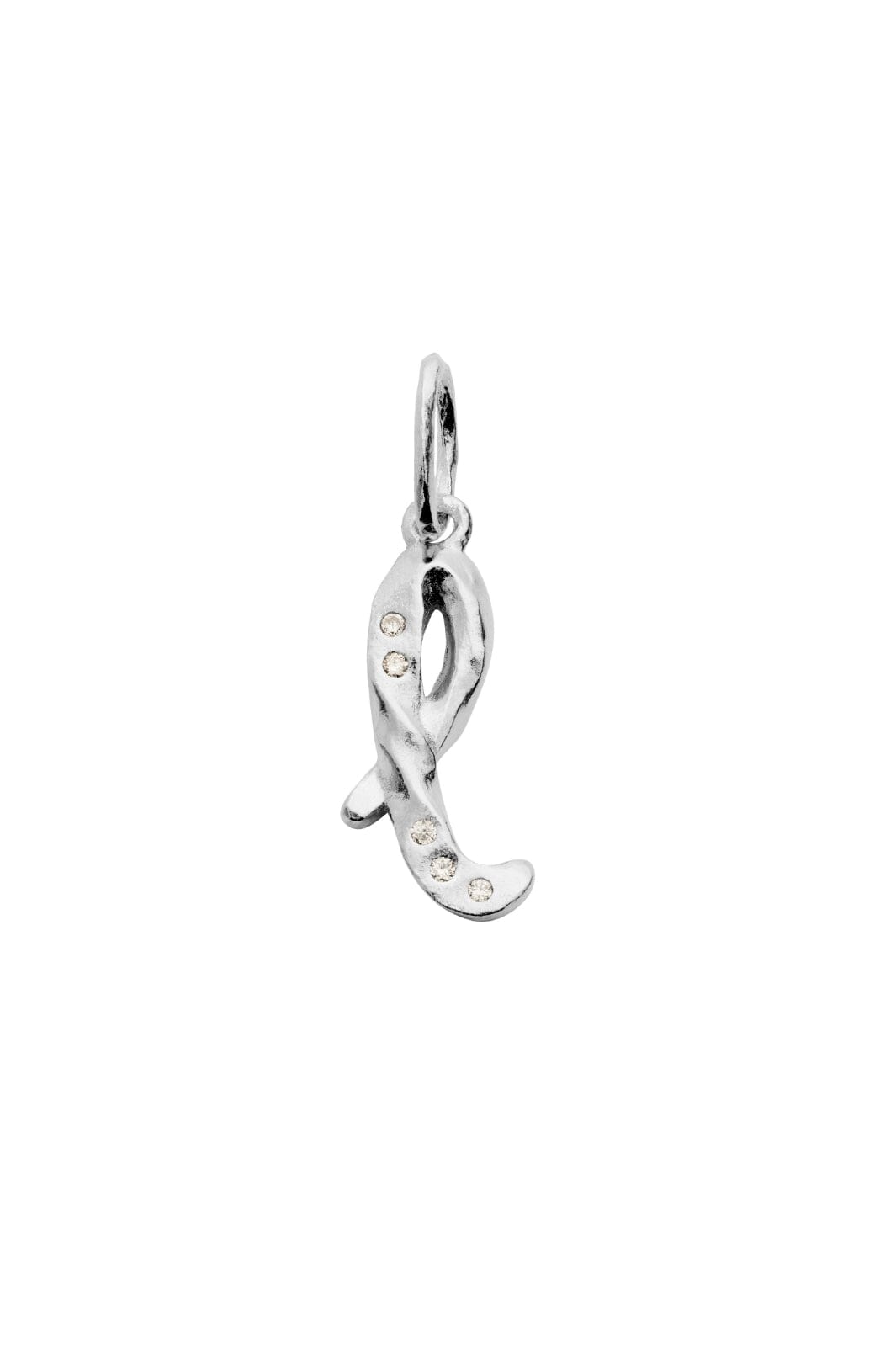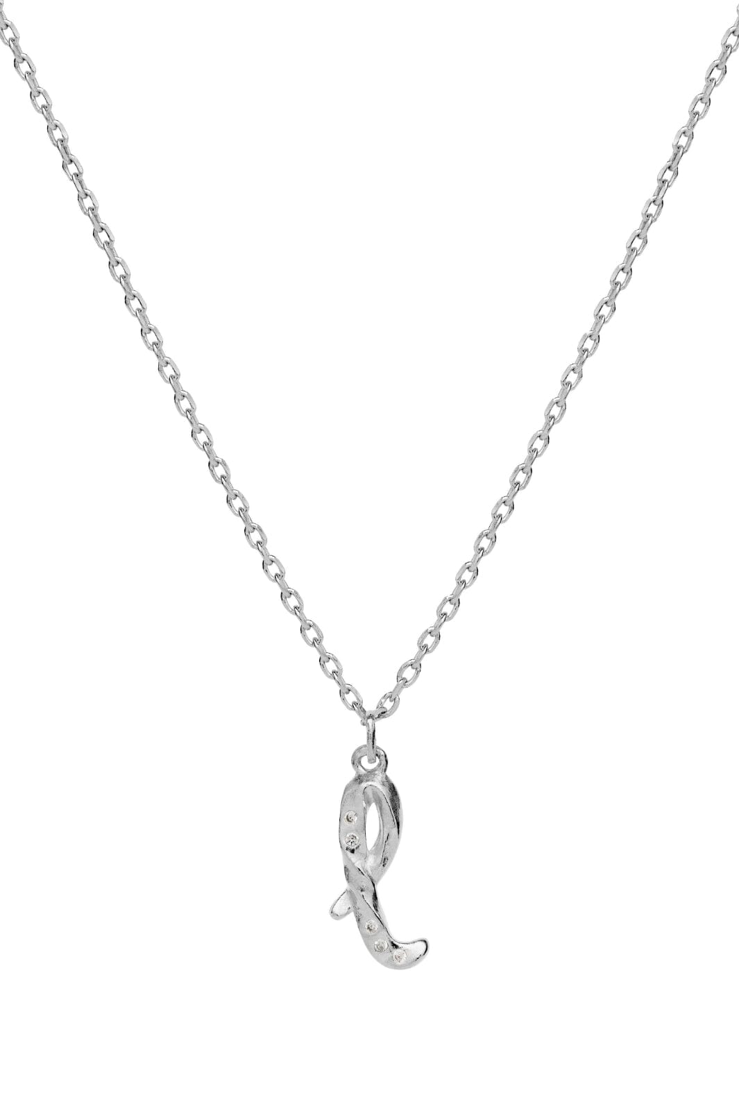 Collier en argent de Maanesten avec une lettre L ondulée en pendentif. Le pendentif a de de petites pierres incrustées dans le design, ce qui lui donne une touche personnelle.