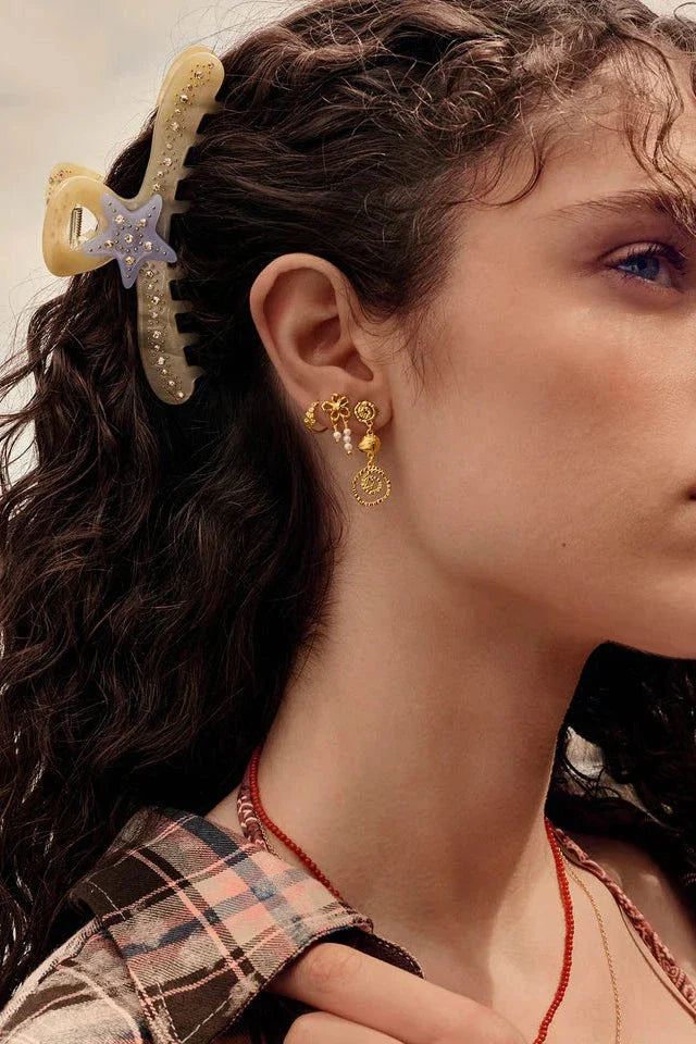 Pince à cheveux de Maanesten en beige clair, inspirée par les étoiles sous-marines. Cette pince à cheveux est un hommage aux étoiles de mer avec une décoration étoile de mer bleue et de petites pierres scintillantes.