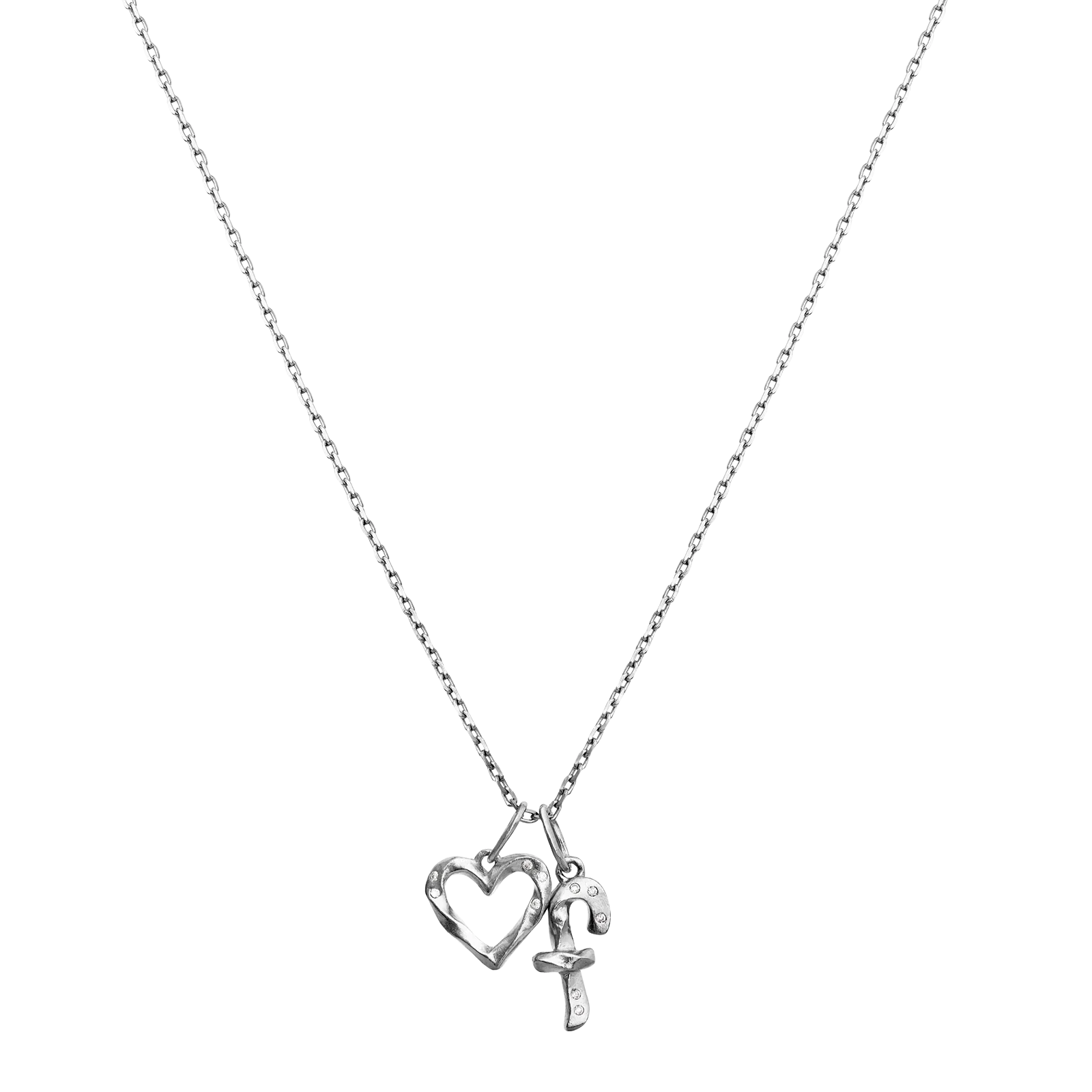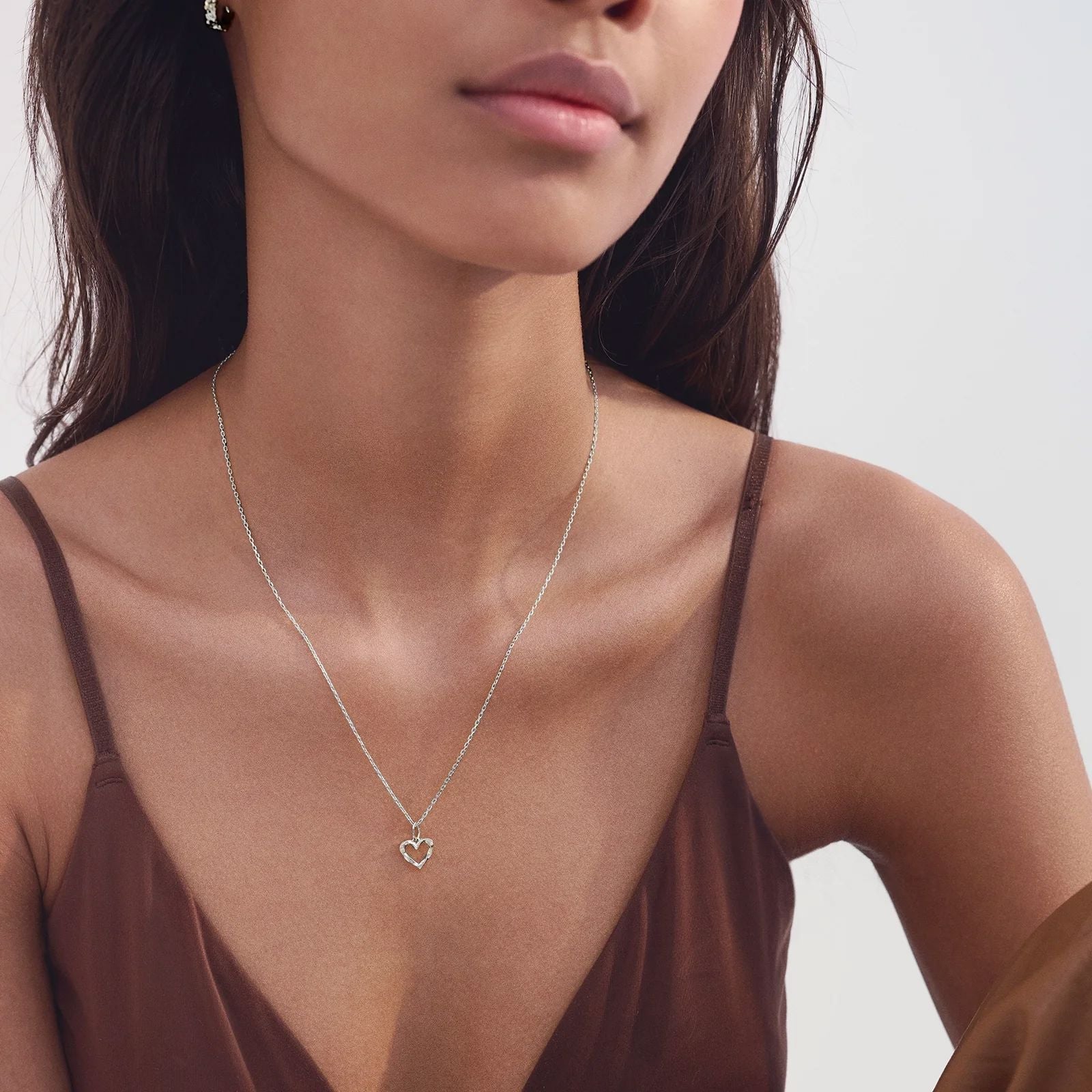 Pendentif en forme de cœur de la marque Maanesten, fabriqué en argent sterling recyclé. Le pendentif présente de petits détails circulaires à la surface et est de couleur argentée.