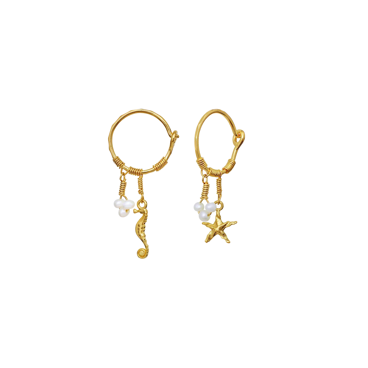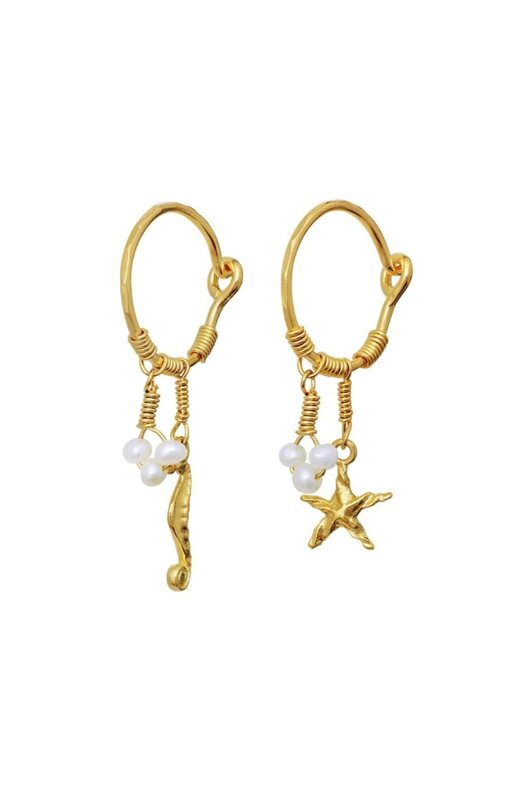 Boucles d'oreilles plaquées or de Maanesten avec des pendentifs en forme d'étoile de mer et de hippocampe. Les petites créoles ont des perles d'eau douce et des pendentifs en fil qui créent une expression maritime.