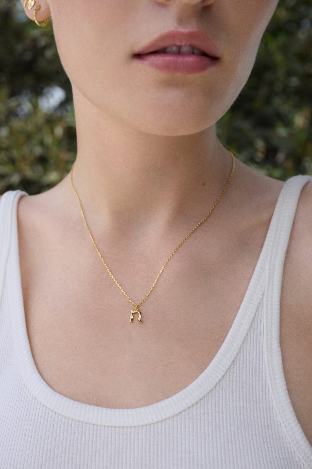 Collier en or de Maanesten avec un pendentif en N orné de petites pierres. Le collier est fabriqué en argent sterling recyclé avec un plaquage en or 18 carats.