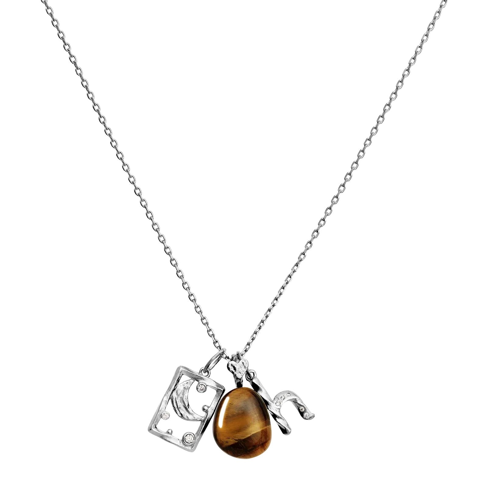 Pendentif de Maanesten avec une pierre œil-de-tigre en forme de goutte dans des nuances dorées et brunes. La pierre présente un motif rayé et une surface lisse. Le pendentif est doté d’une bélière en forme de cœur.