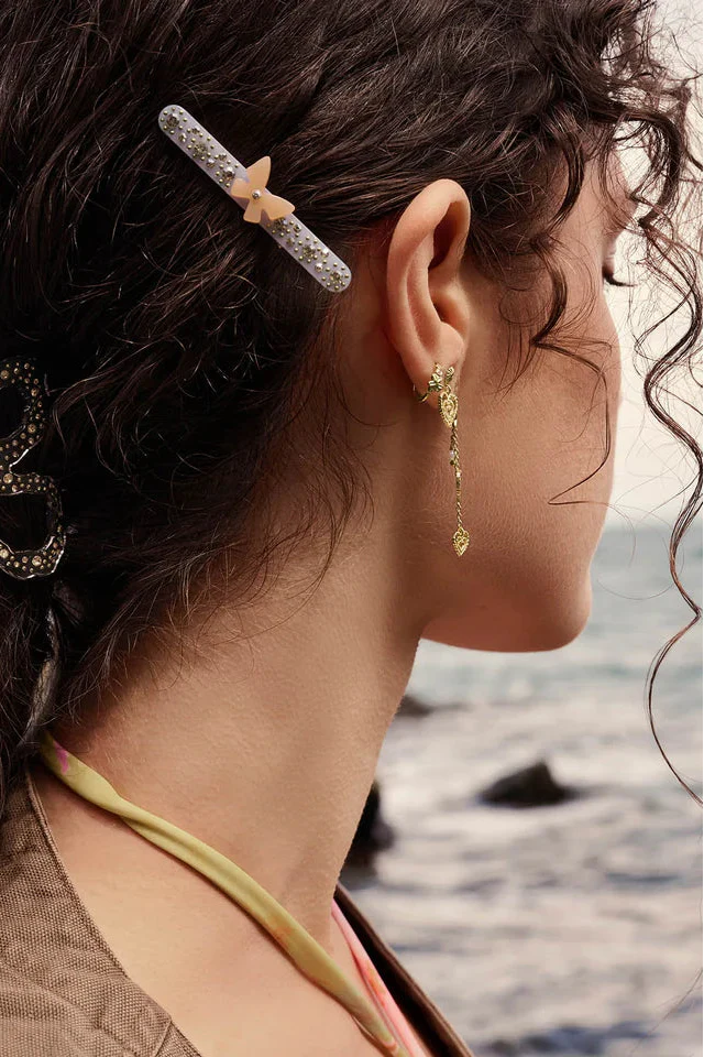 Barrette à cheveux de Maanesten avec un petit papillon en décoration. La barrette est ornée de pierres scintillantes en acétate bleu clair.