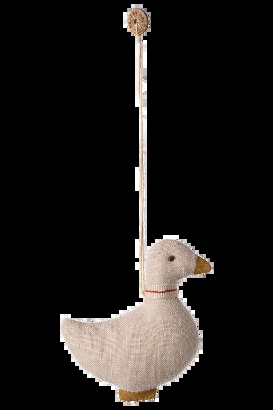 Pendant d’oie de Maileg en lin beige. L’oie a une forme douce avec un petit liseré rouge autour du cou et une ficelle pour la suspendre.