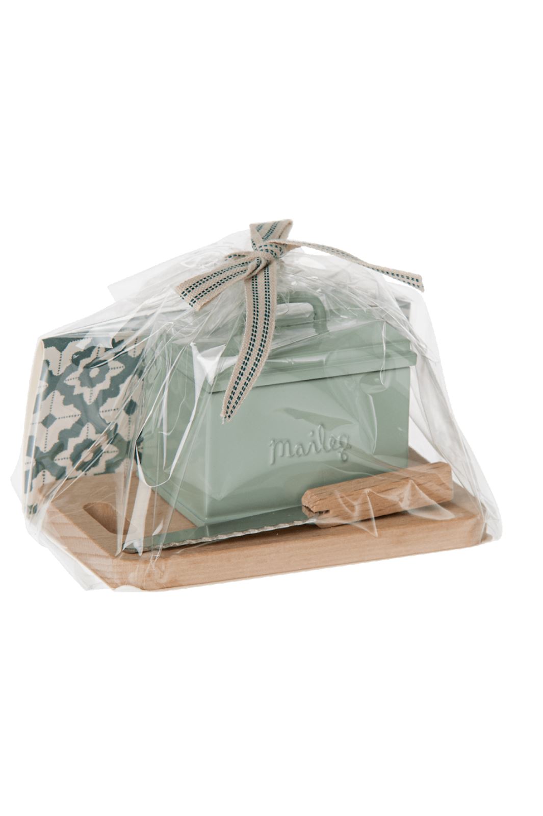 Boîte à pain vert clair de Maileg avec planche à découper et ustensiles assortis. La boîte à pain a Bread gravé sur le devant et est fabriquée dans une combinaison de bois, métal et polyresin.