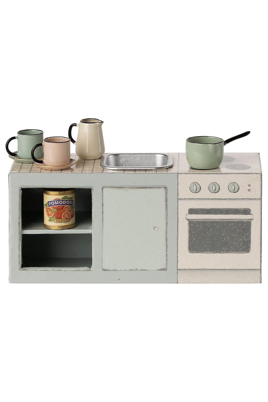 Une table de cuisine de Maileg, conçue pour les souris. La table dispose d’un évier intégré et d’une cuisinière avec trois boutons ainsi que d’étagères pour les ustensiles de cuisine.