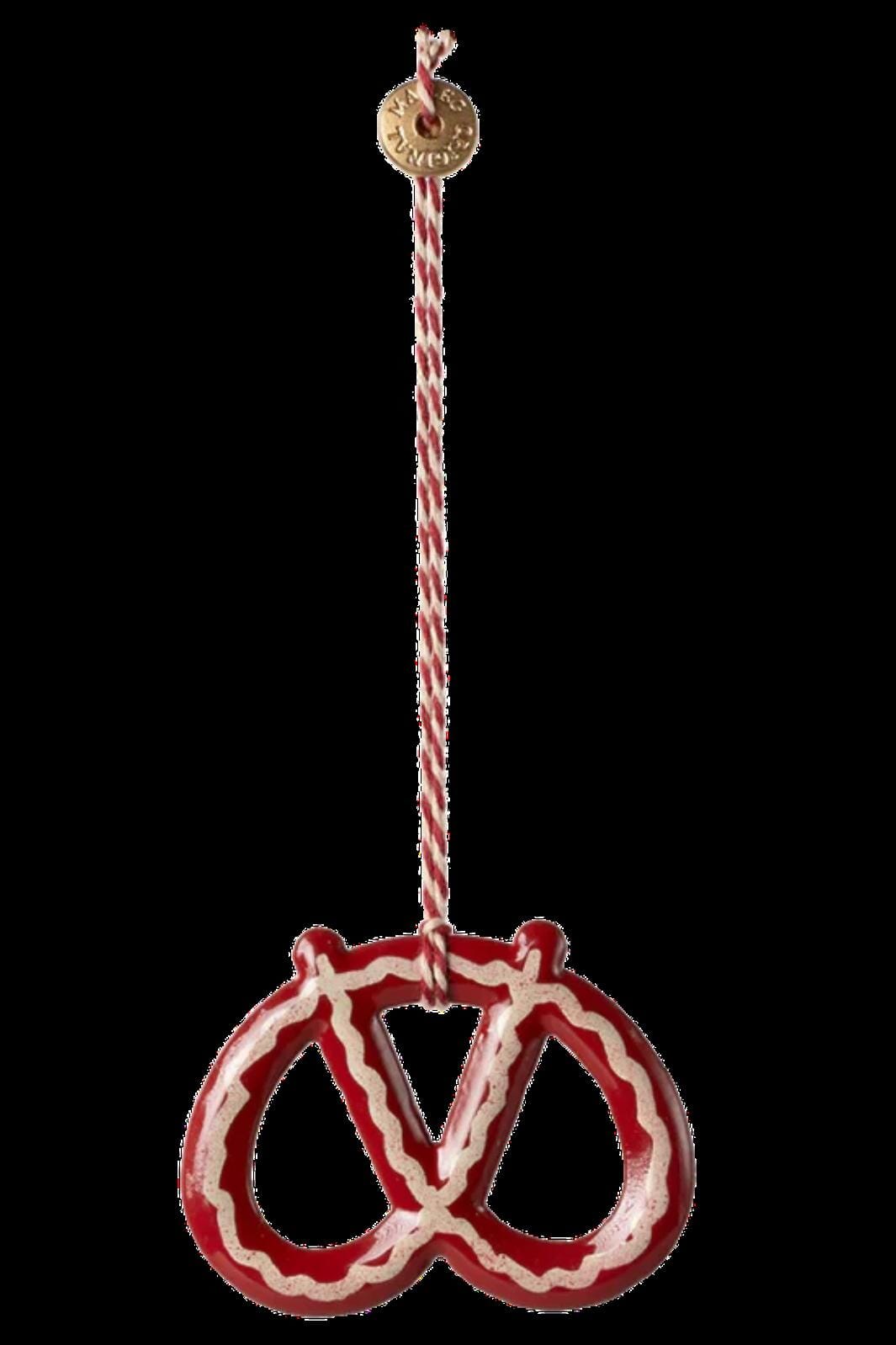 Suspension en métal de Maileg en forme de bretzel avec des rayures rouges et blanches. Fabriquée en métal avec des détails peints à la main et une attache torsadée.