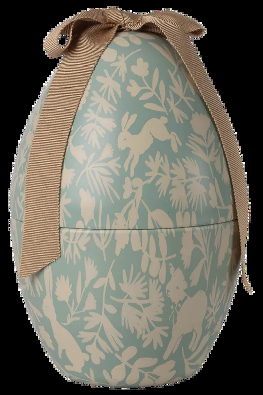 Œuf de Pâques de taille moyenne de Maileg en métal bleu clair avec un motif de lapins et de plantes. L’œuf est orné d’un nœud brun sur le dessus.
