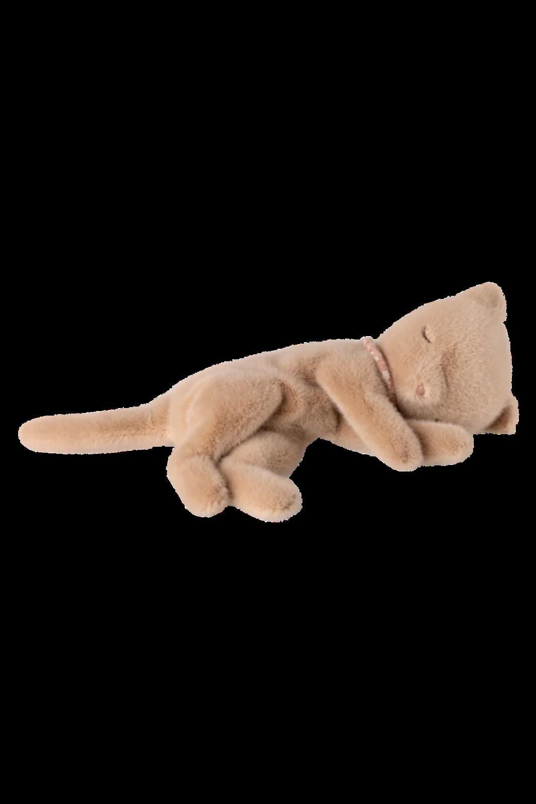 Un chaton en peluche en position de sommeil de Maileg. La figurine a une longue queue et un petit col autour du cou.