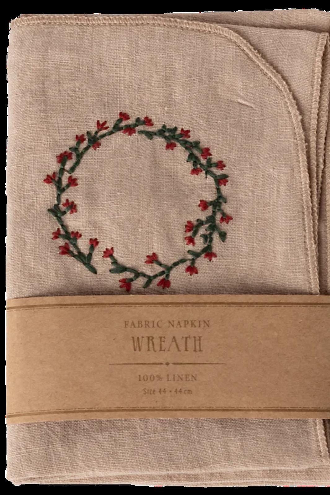Serviette en tissu beige de Maileg avec un motif de couronne brodé composé de feuilles vertes et de fleurs rouges. La serviette est fabriquée en lin doux.
