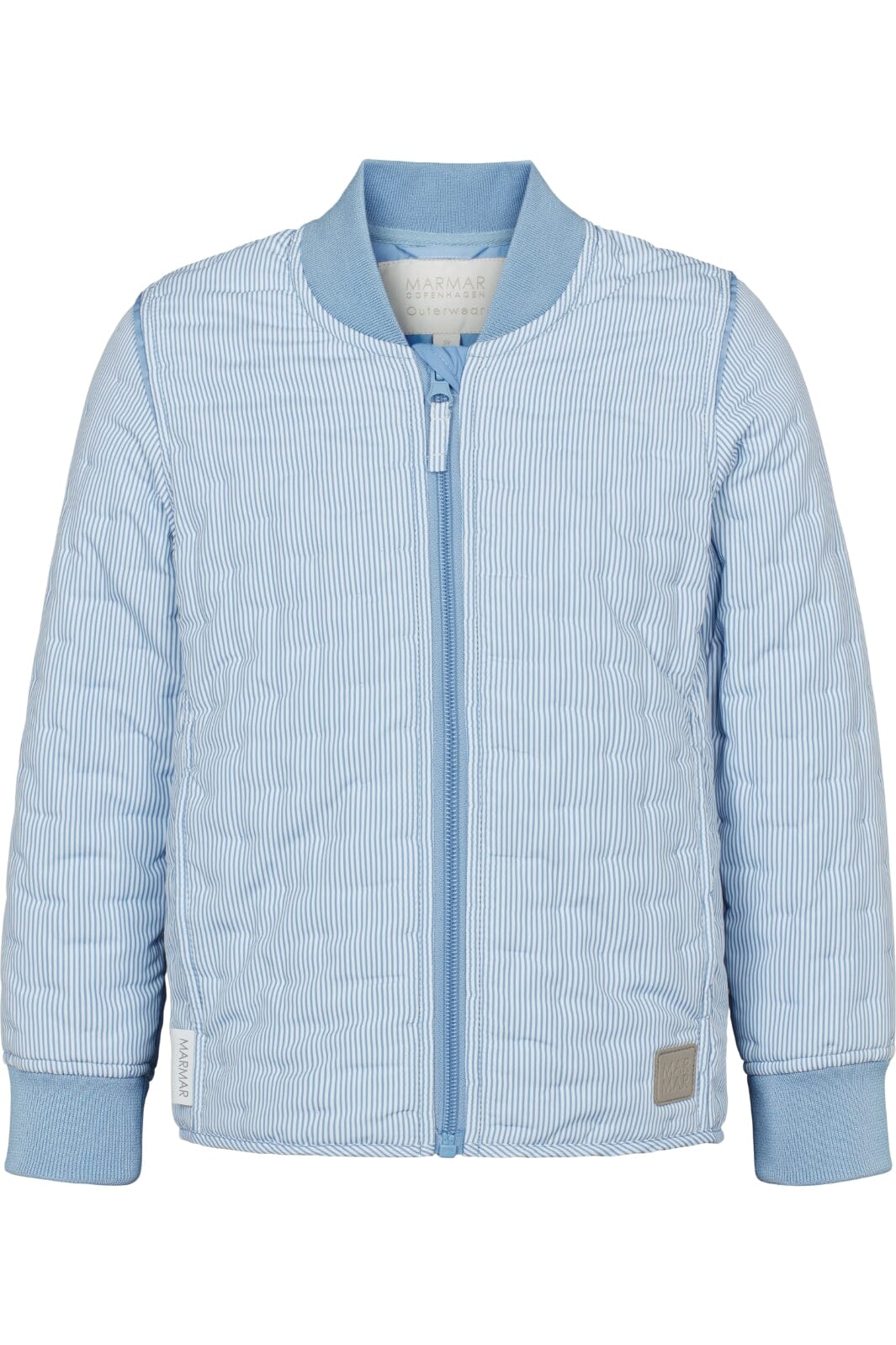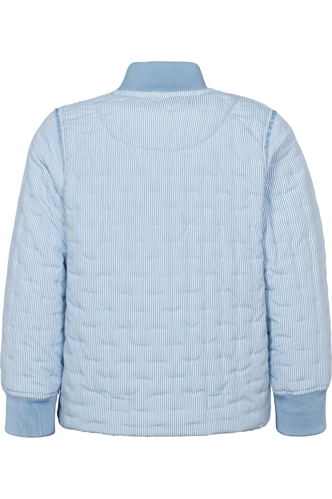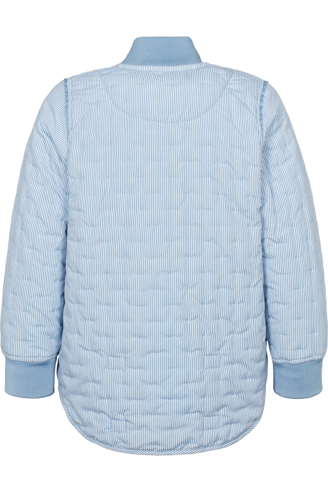 Une veste rayée en bleu clair de MarMar Copenhagen. Elle a un col rond avec fermeture éclair et des manches longues avec des poignets côtelés. Des coutures décoratives mettent en valeur le motif rayé.