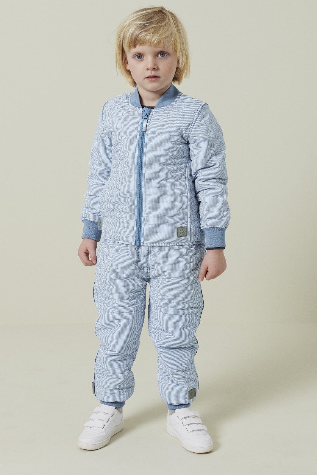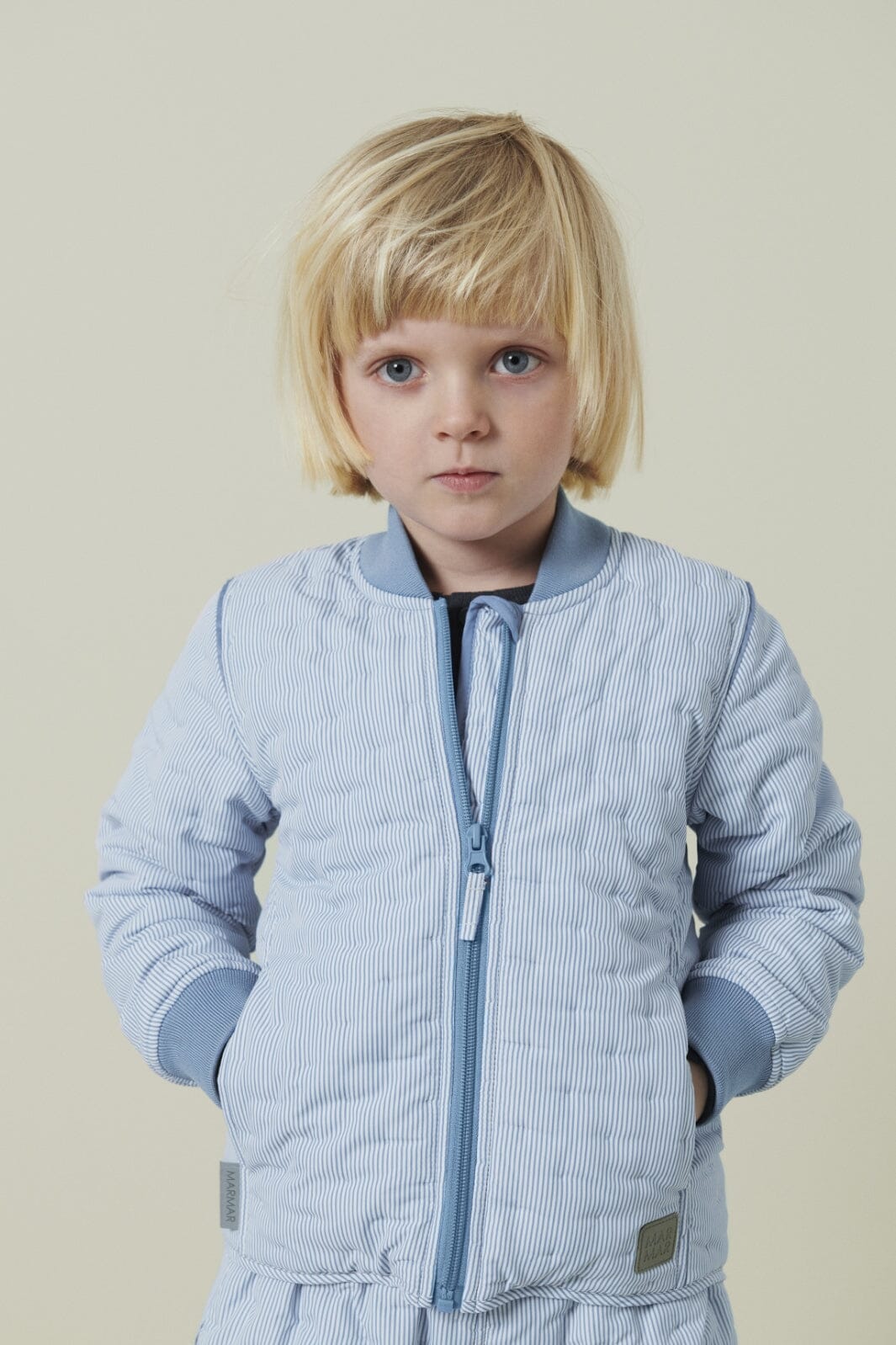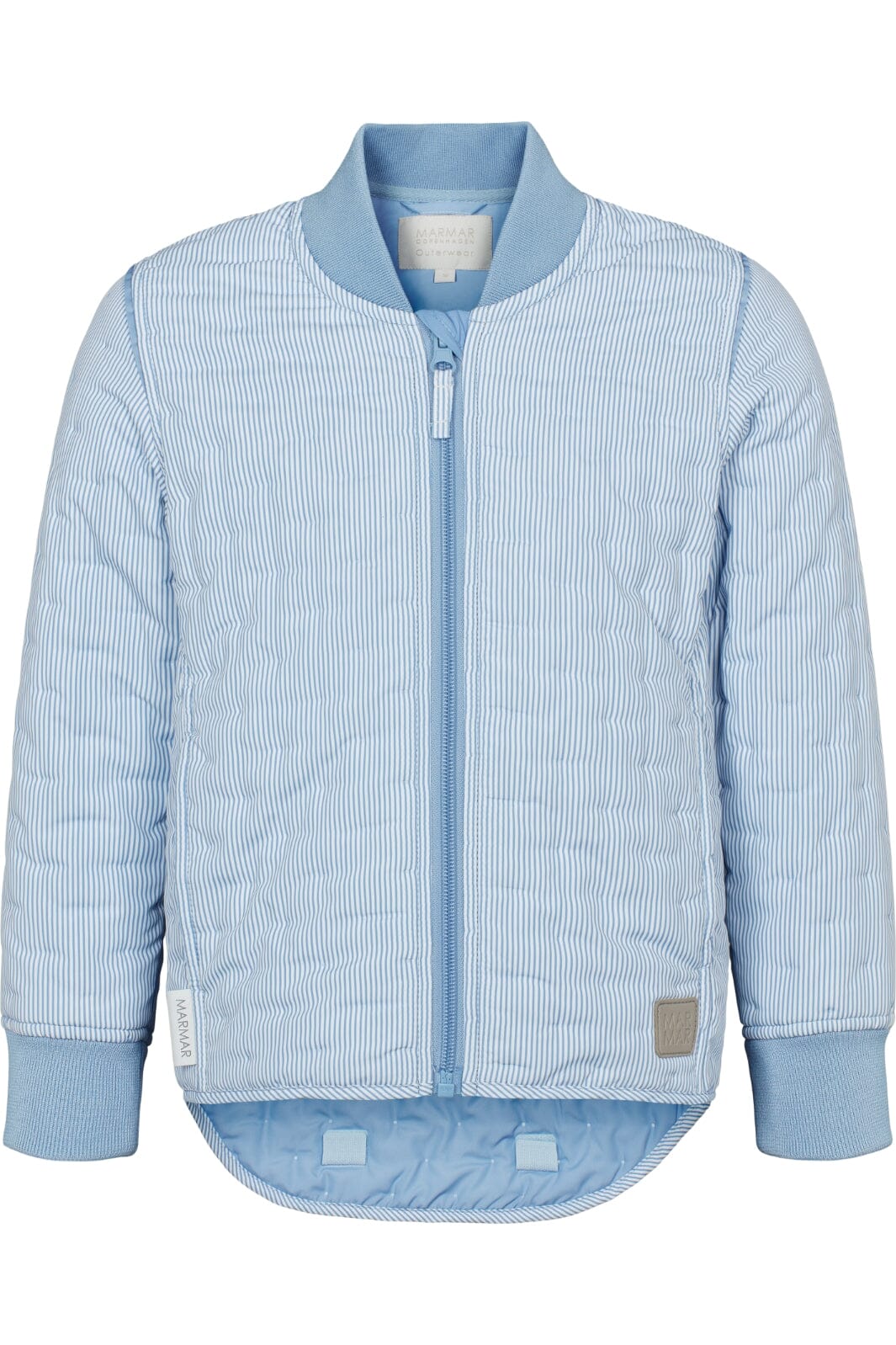 Une veste rayée en bleu clair de MarMar Copenhagen. Elle a un col rond avec fermeture éclair et des manches longues avec des poignets côtelés. Des coutures décoratives mettent en valeur le motif rayé.