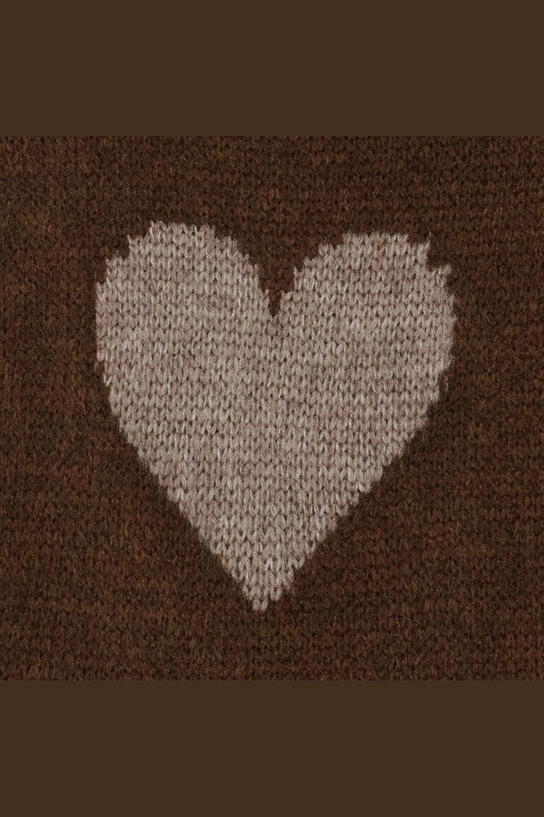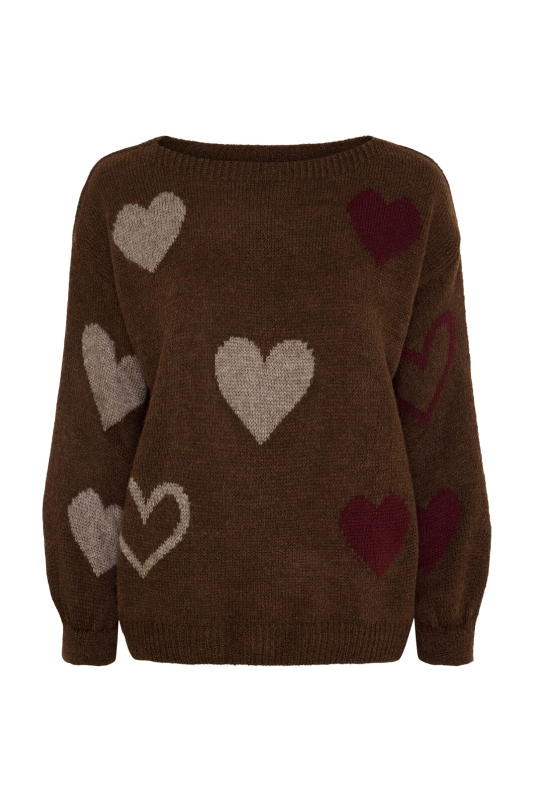 Pull brun de Marta Du Chateau avec des motifs en forme de cœur sur le devant en gris et bordeaux. L'arrière est uni brun sans motifs.