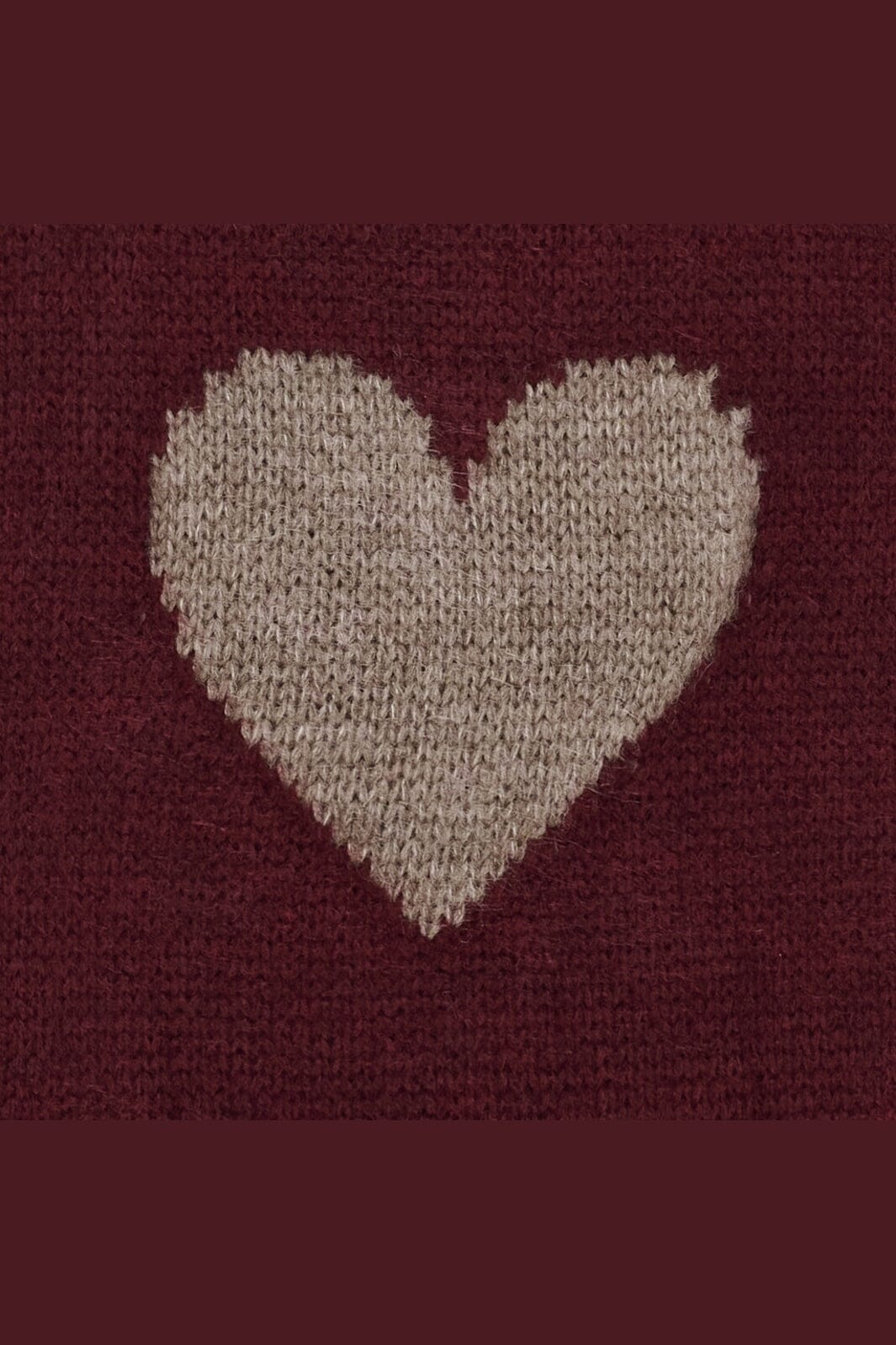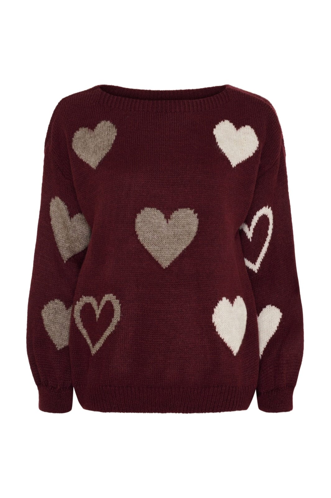 Pull bordeaux de Marta Du Chateau avec des motifs en forme de cœur dans différentes nuances. Le pull a un col rond et des manches longues.