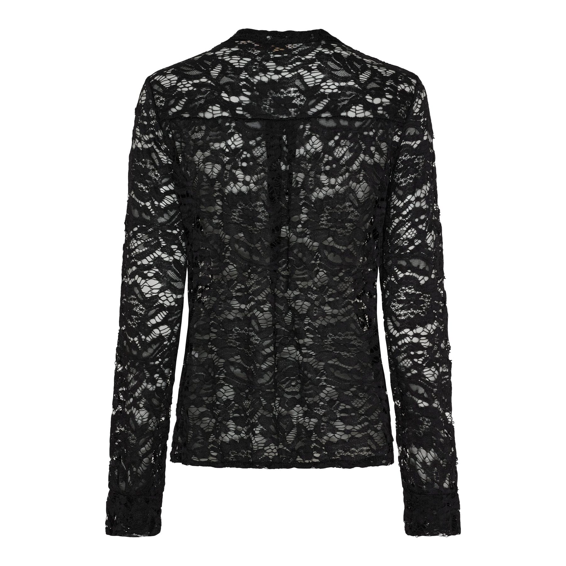 Chemise en dentelle noire de Marta Du Chateau avec des manches longues et un col de chemise. La chemise présente un motif floral en dentelle et des fronces sur le devant.