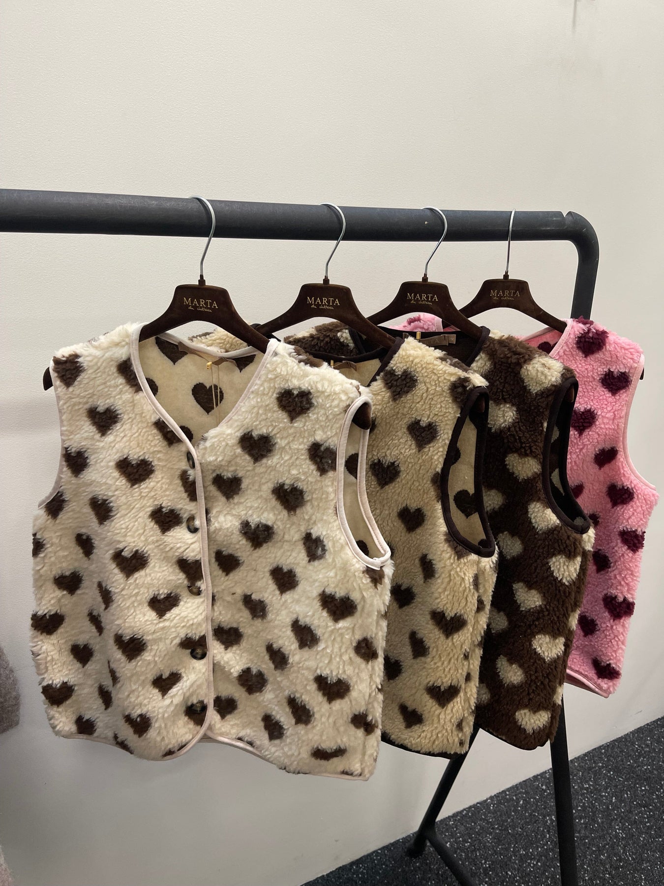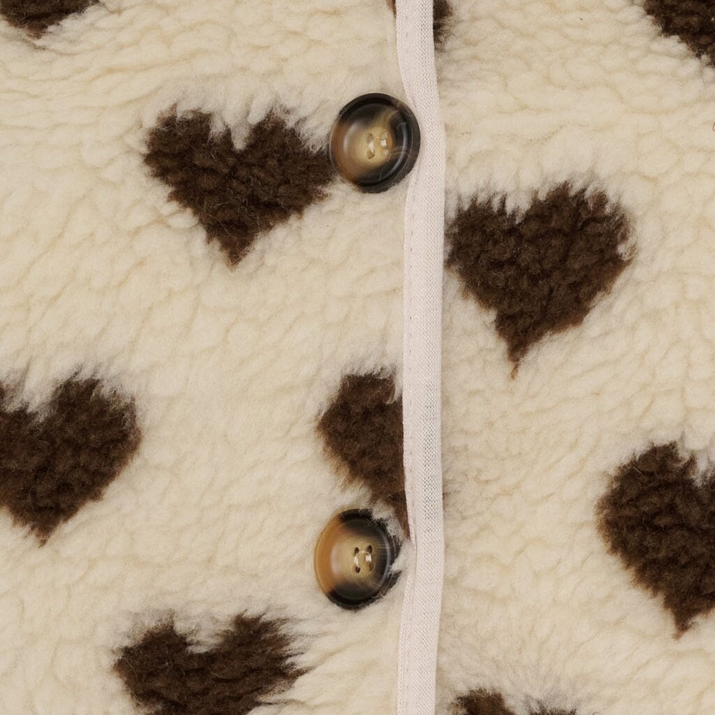 Gilet de Marta Du Chateau en crème avec des motifs en forme de cœur marron foncé. Le gilet a des bords sombres le long des côtés et une fermeture à boutons à l'avant.