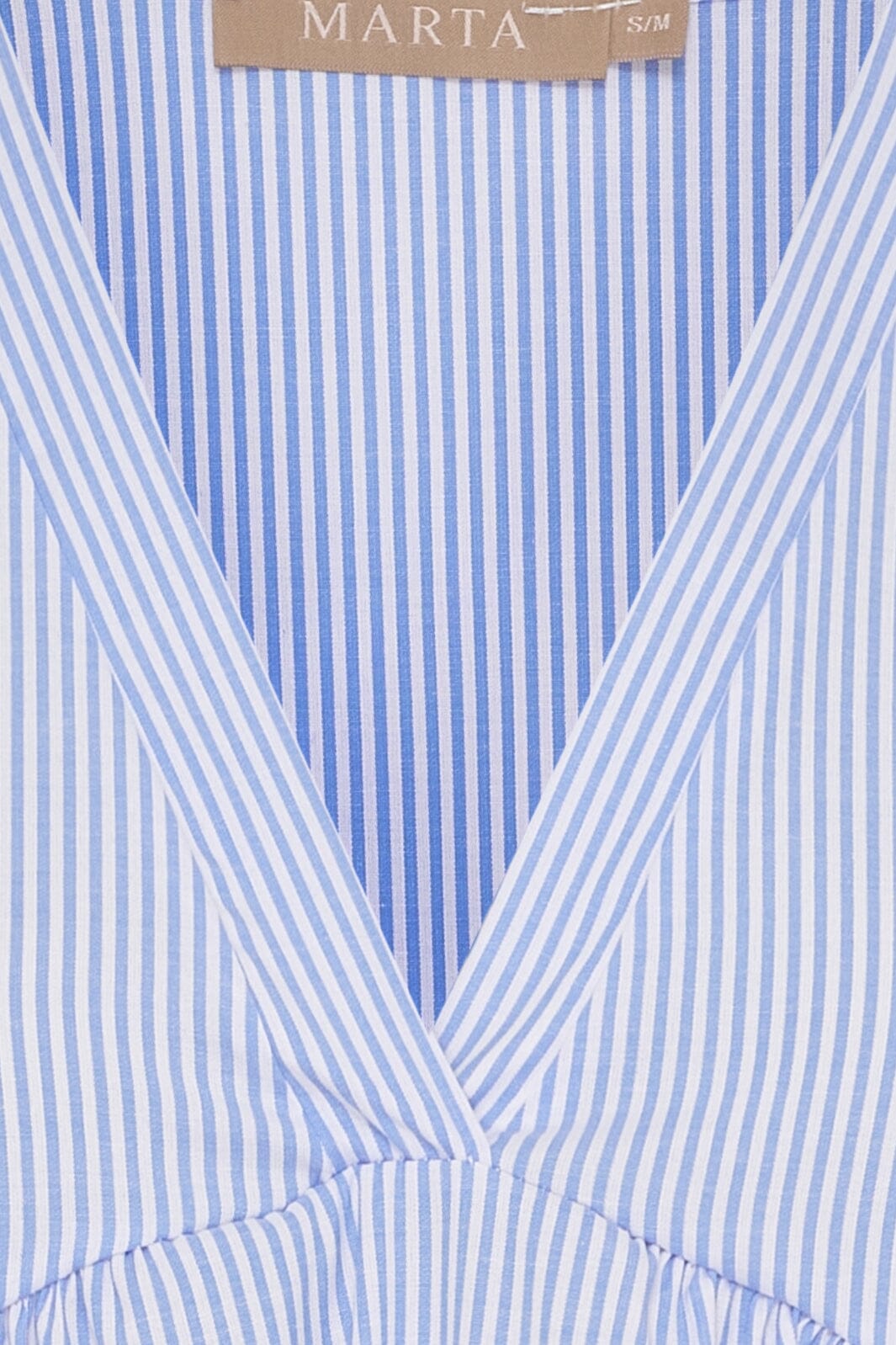 Robe rayée de Marta Du Chateau avec des rayures bleu clair et blanches. La robe a un décolleté en V et des détails volantés sur les manches. Elle arrive au milieu du mollet.