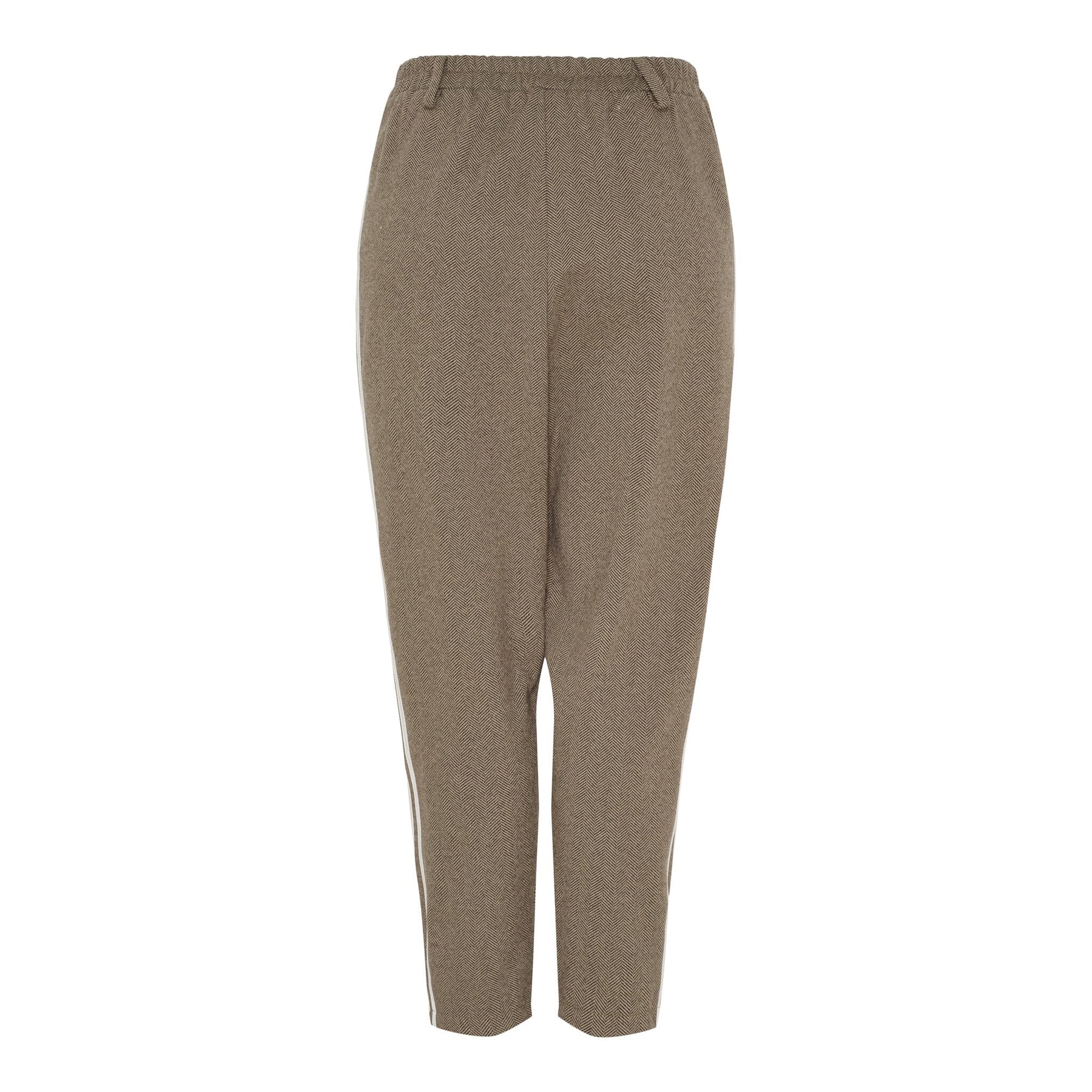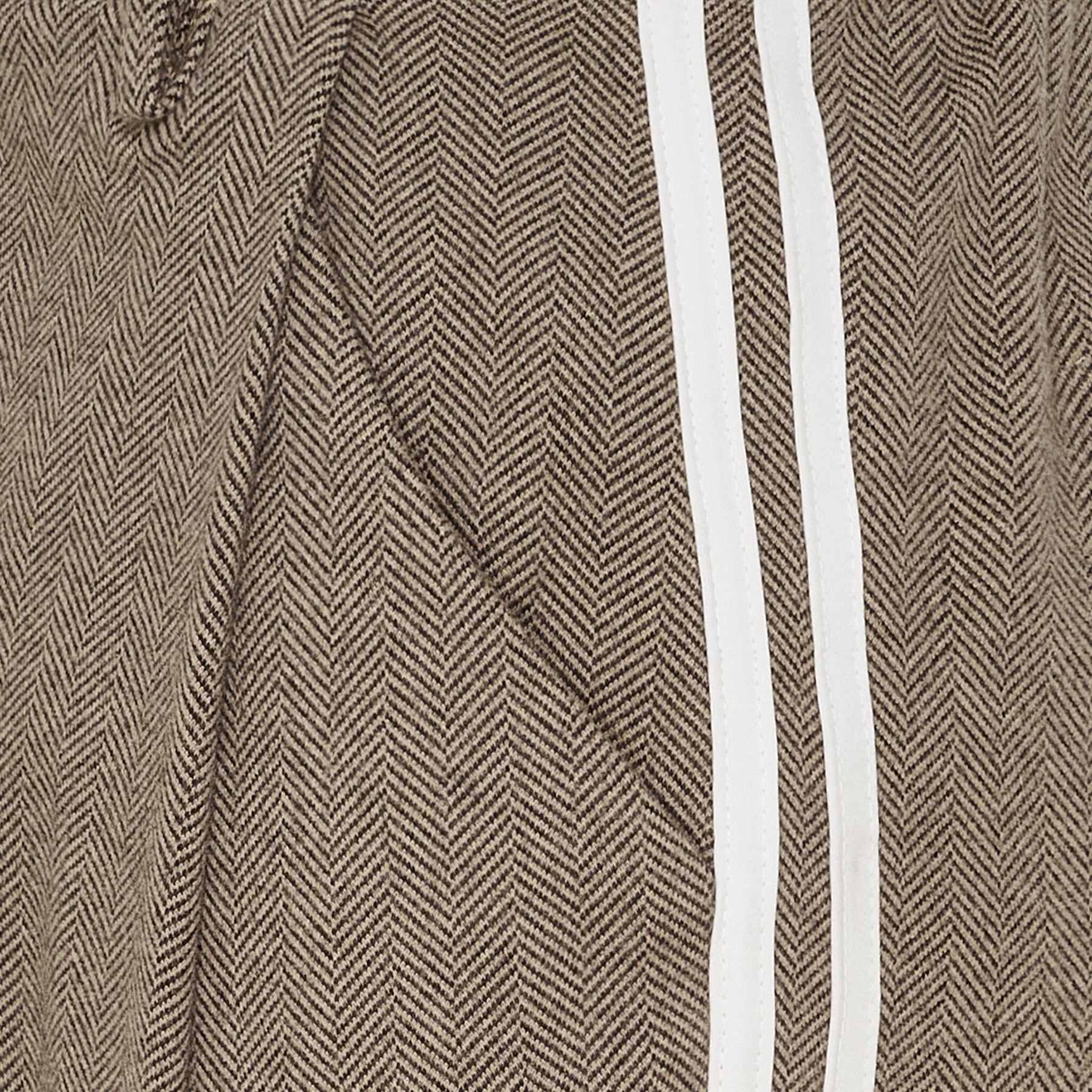 Pantalons bruns de Marta Du Chateau avec des rayures blanches le long des jambes. Les pantalons ont une coupe ample et arrivent au milieu du mollet. Ils ont à la fois une fermeture éclair, un élastique et des boutons à la taille.