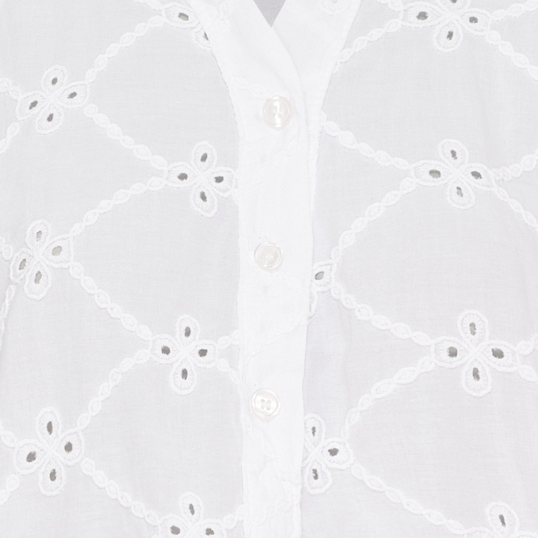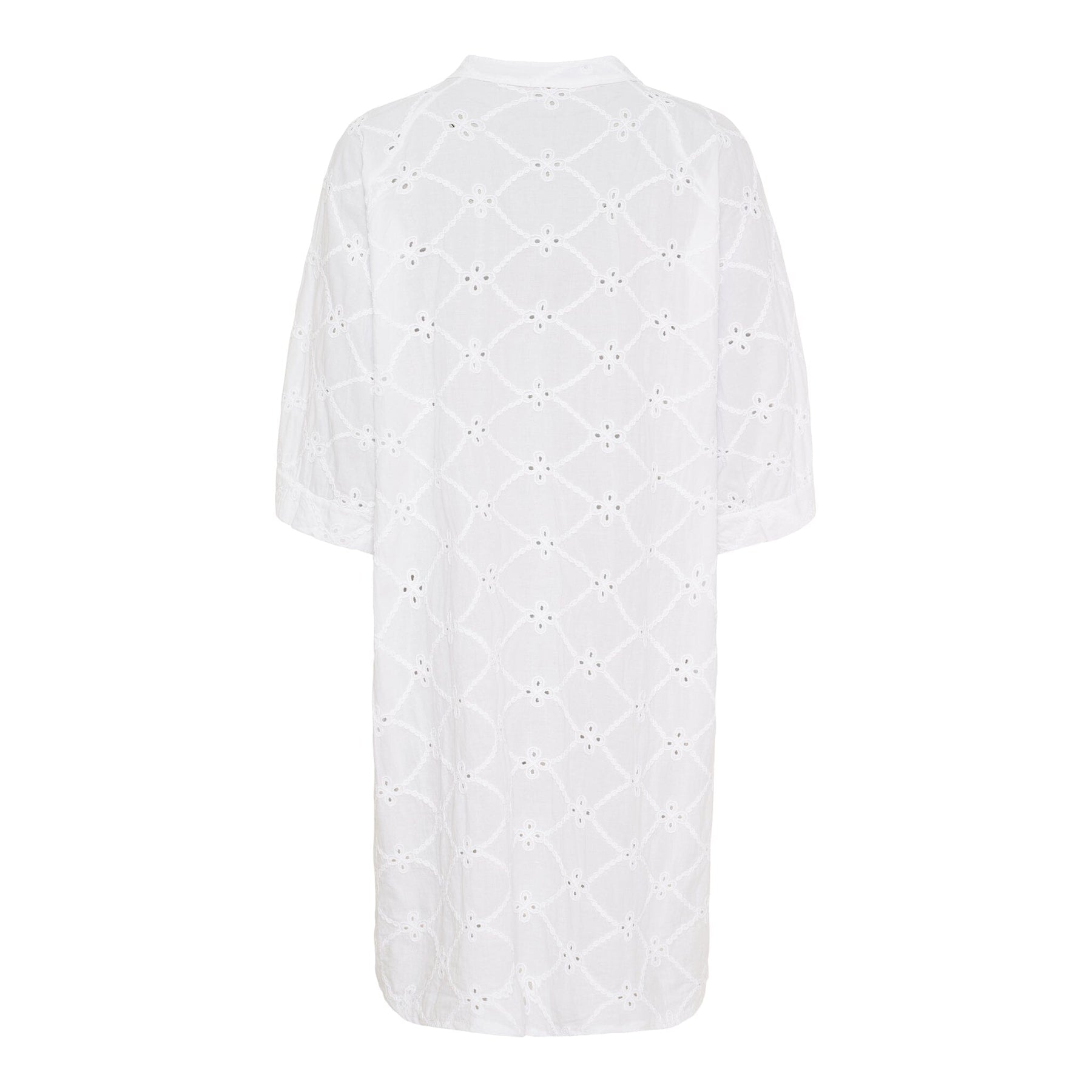Robe blanche de Marta Du Chateau avec motif floral brodé. La robe a un col chemise, des manches 3/4 et une longueur genou. La coupe ample offre une bonne liberté de mouvement.