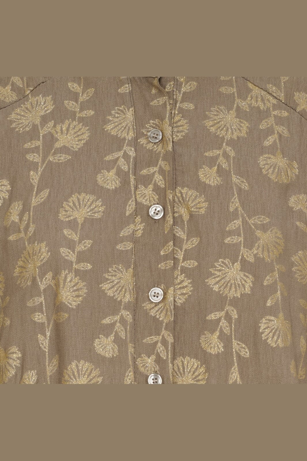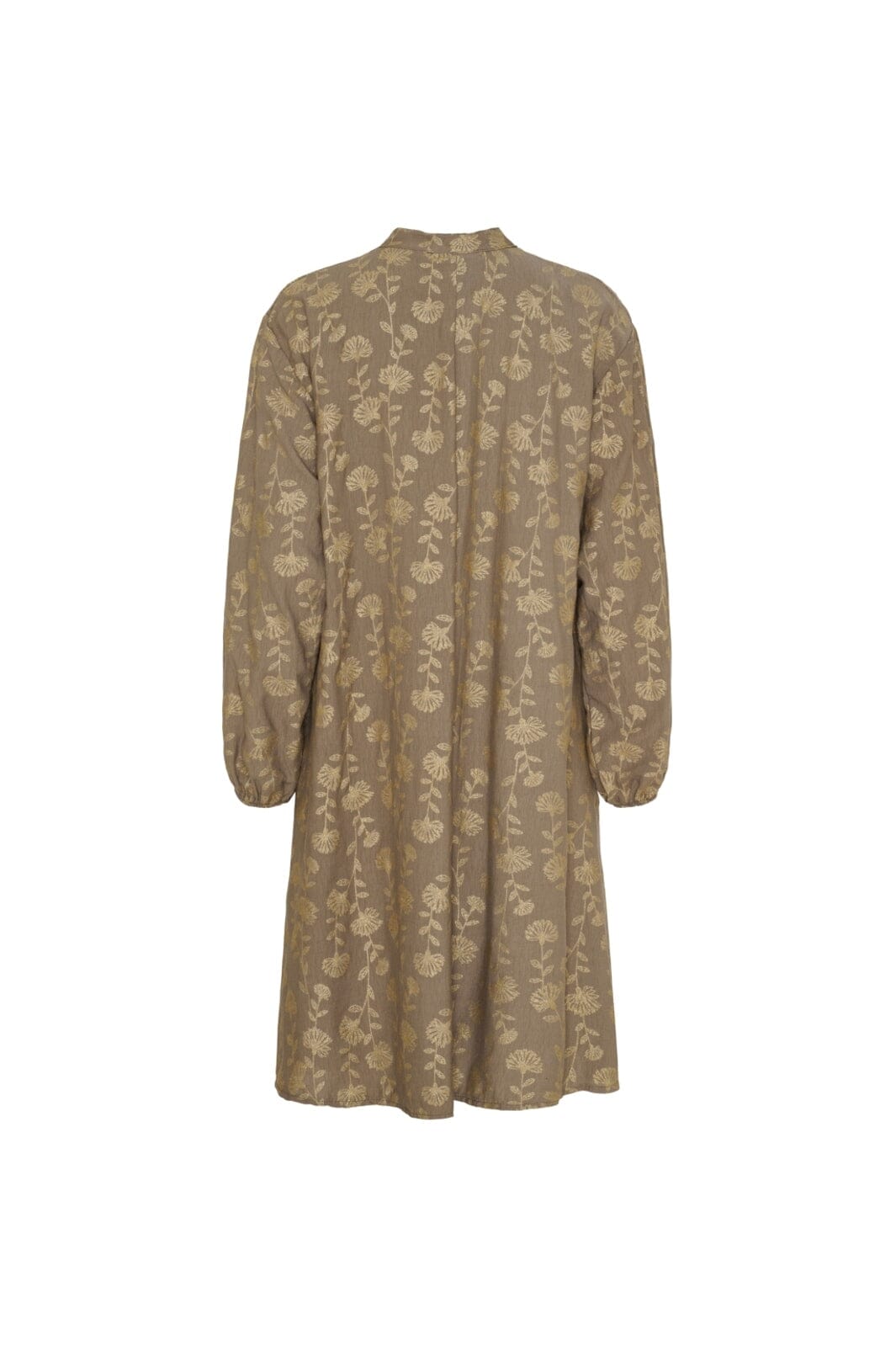 Robe mi-longue de Marta Du Chateau en brun avec un motif floral doré. La robe a des manches longues avec élastique et une fermeture à boutons sur toute la longueur avec un petit col.