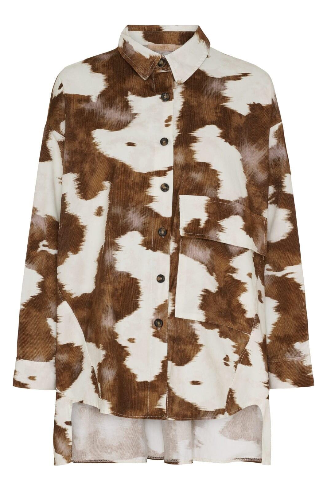 Chemise de Marta Du Chateau avec un motif inspiré des vaches en brun et blanc. Elle a un col de chemise, des manches longues et une poche poitrine sur le côté gauche.