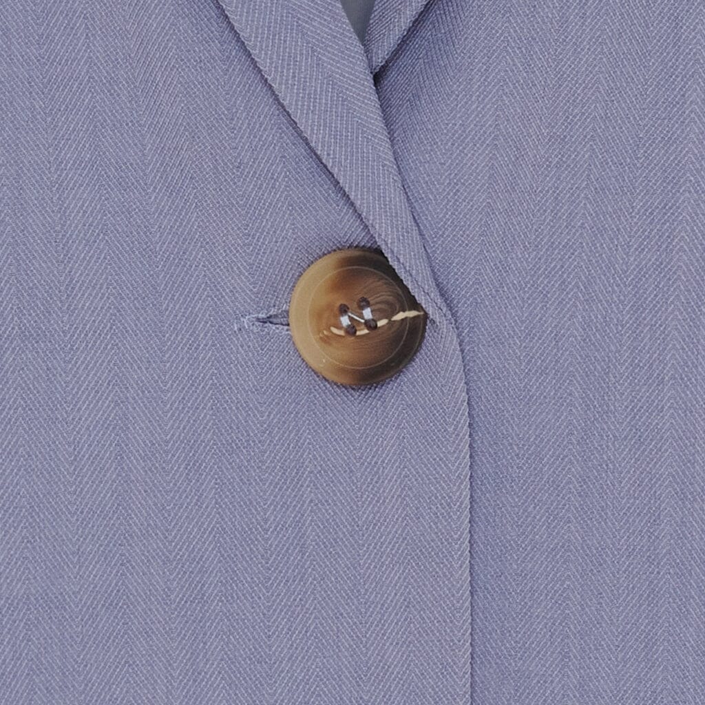 Un blazer bleu clair de Marta Du Chateau avec un design à revers classique et une fermeture à un seul bouton. Le blazer possède deux poches avant à rabat.