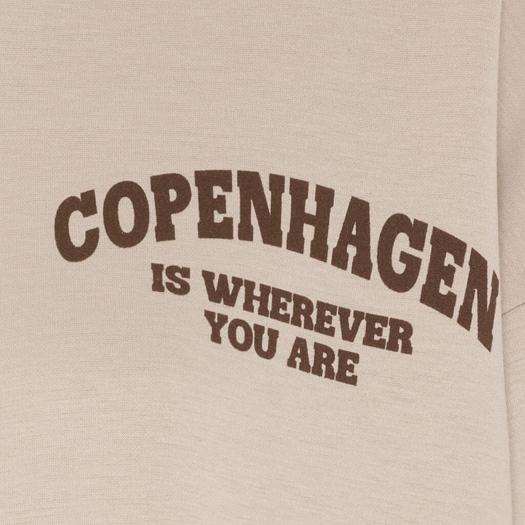 Un cardigan beige de Marta Du Chateau avec un texte marron foncé. Le cardigan convient aussi bien au quotidien, à l’entraînement qu’à la maison.