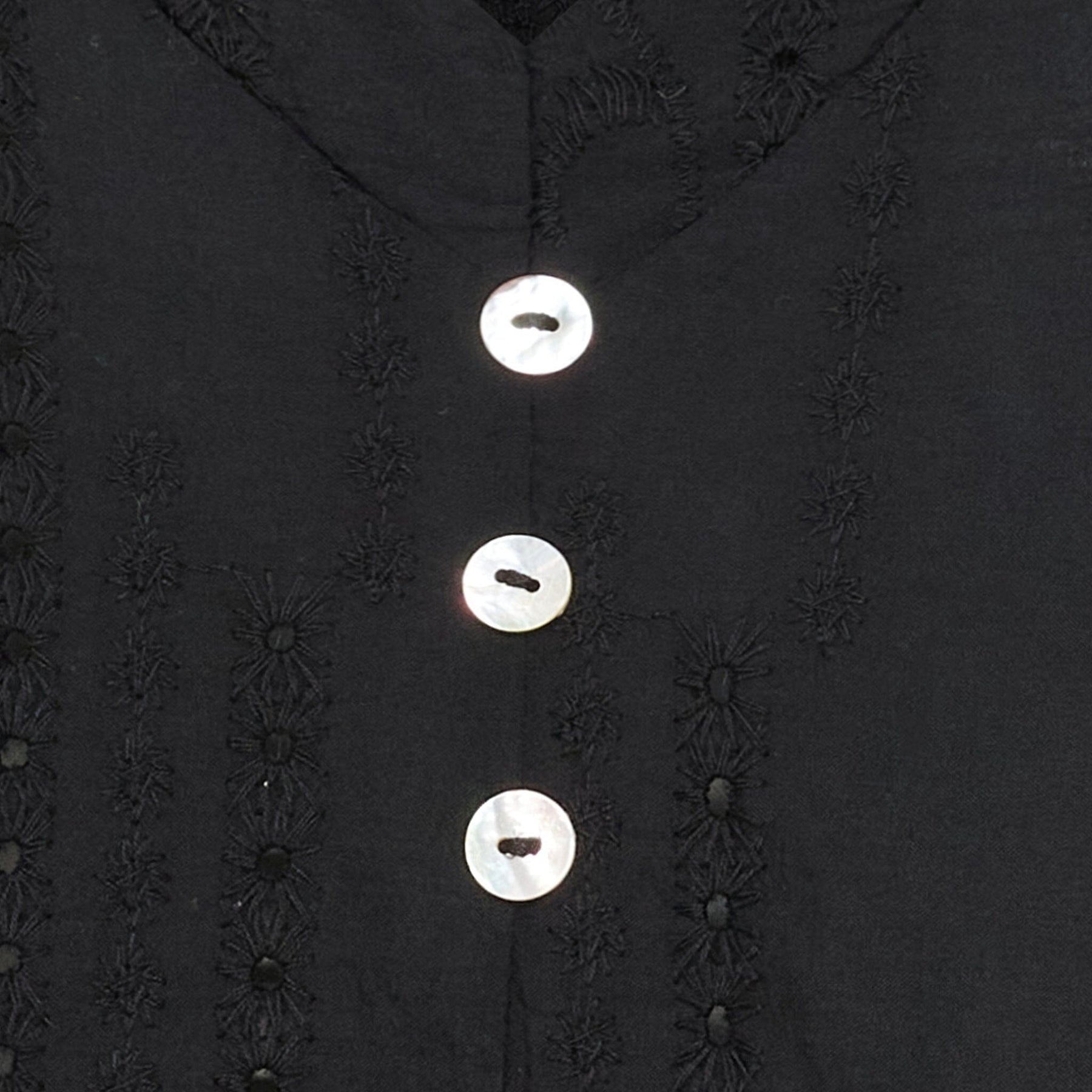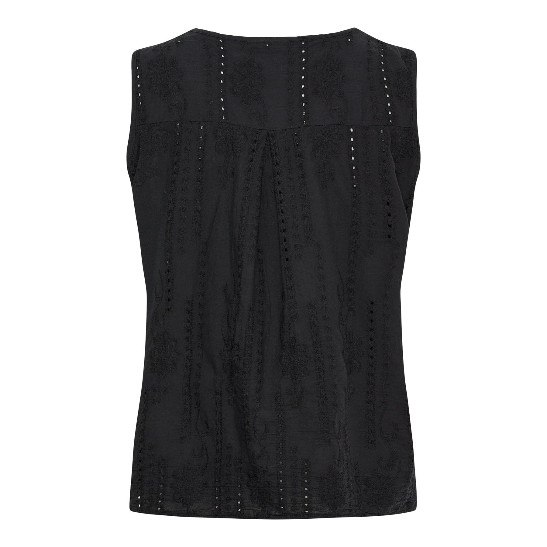 Top sans manches noire de Marta Du Chateau avec décolleté en V et détails brodés. Le top a trois boutons en perles à l'avant et une coupe ample qui offre une bonne liberté de mouvement.