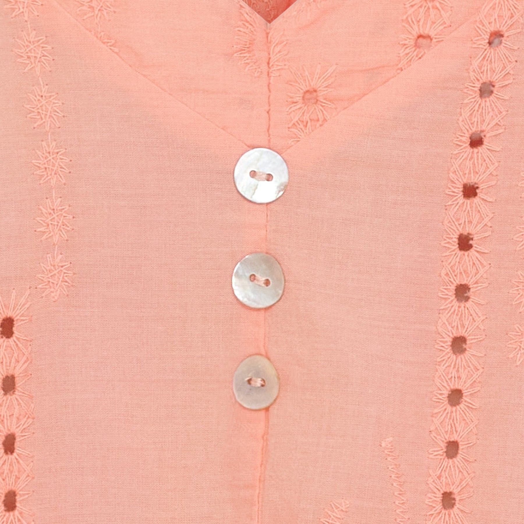 Top orange de Marta Du Chateau avec motif brodé et décolleté en V. Le top a trois boutons à l'avant et une coupe ample qui offre une bonne liberté de mouvement.