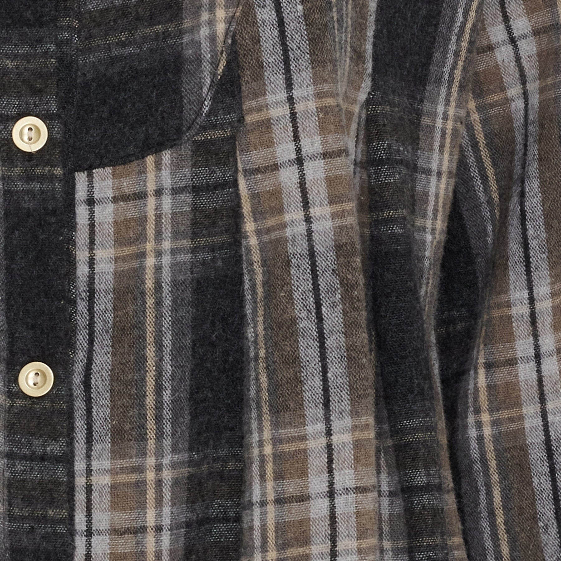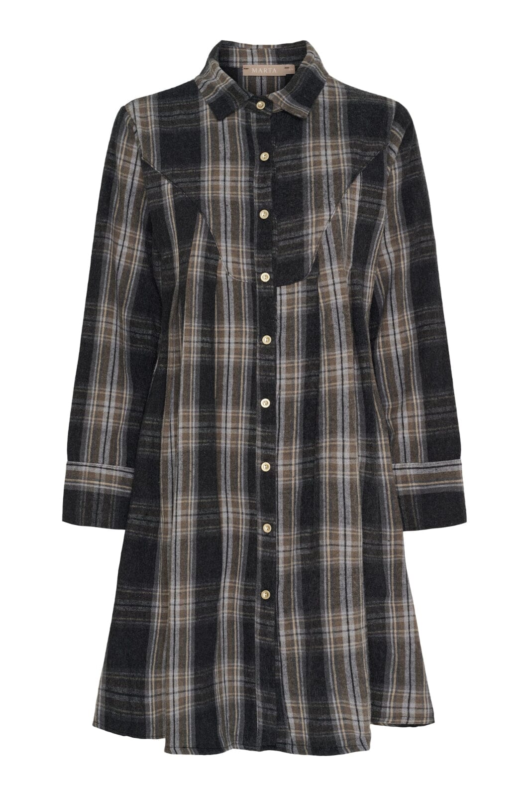 Robe à carreaux grise de Marta Du Chateau avec col chemise et fermeture à boutons à l'avant. La robe a des manches 3/4 et des fronces qui lui donnent une expression féminine.