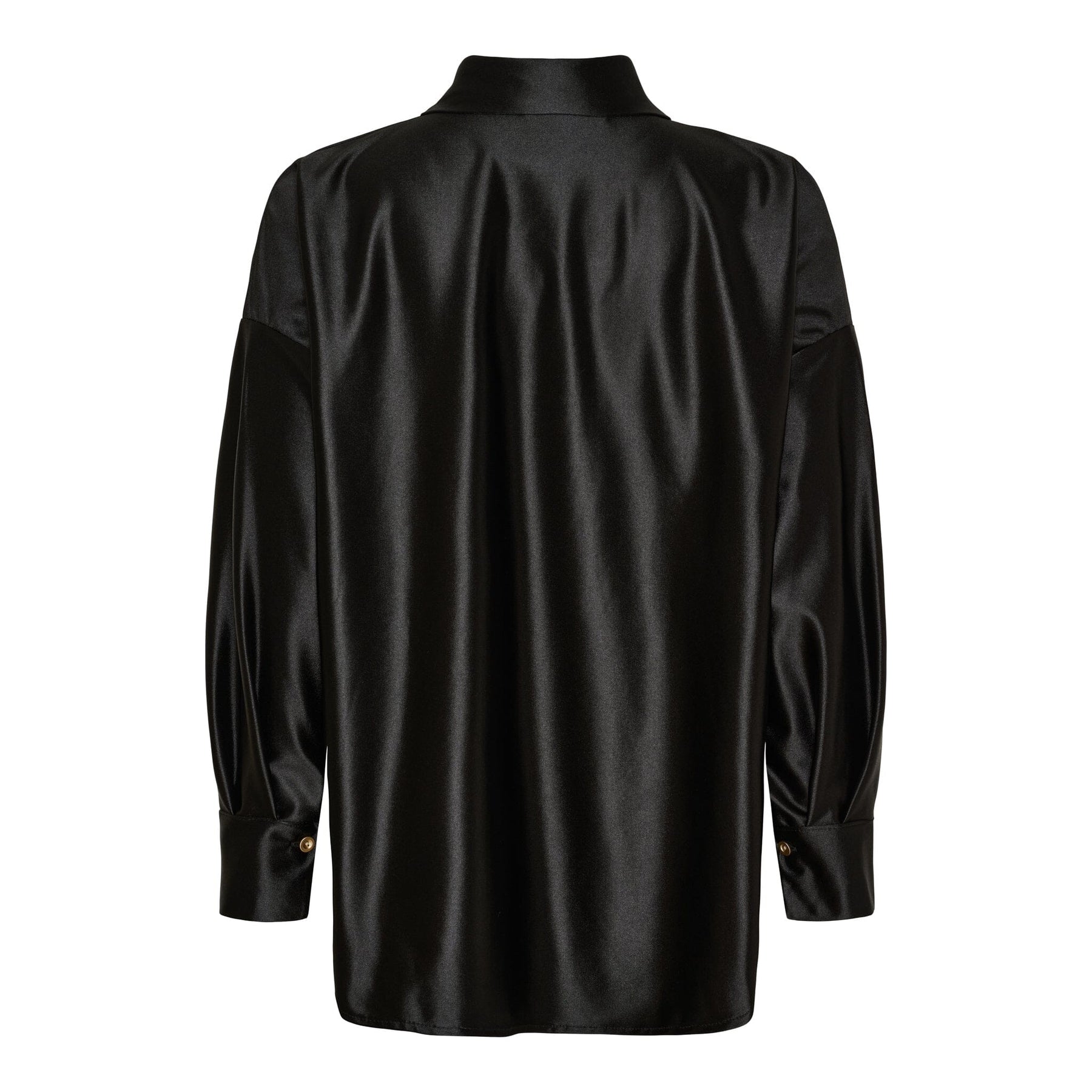 Chemise noire de Marta Du Chateau avec surface brillante. La chemise a un col classique, une coupe oversized et des manches longues avec fermeture à boutons.