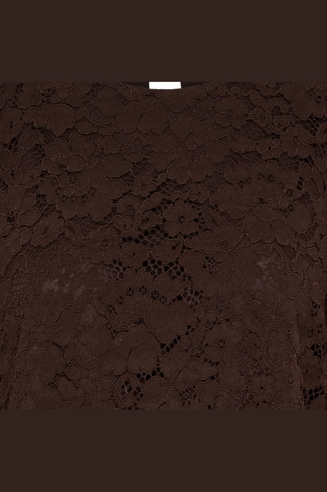 Robe en dentelle brune de Marta Du Chateau avec motif floral. La robe a des manches courtes, un col rond et arrive jusqu'à la cuisse. Une fermeture à boutons à l'arrière la rend facile à enfiler et à enlever.