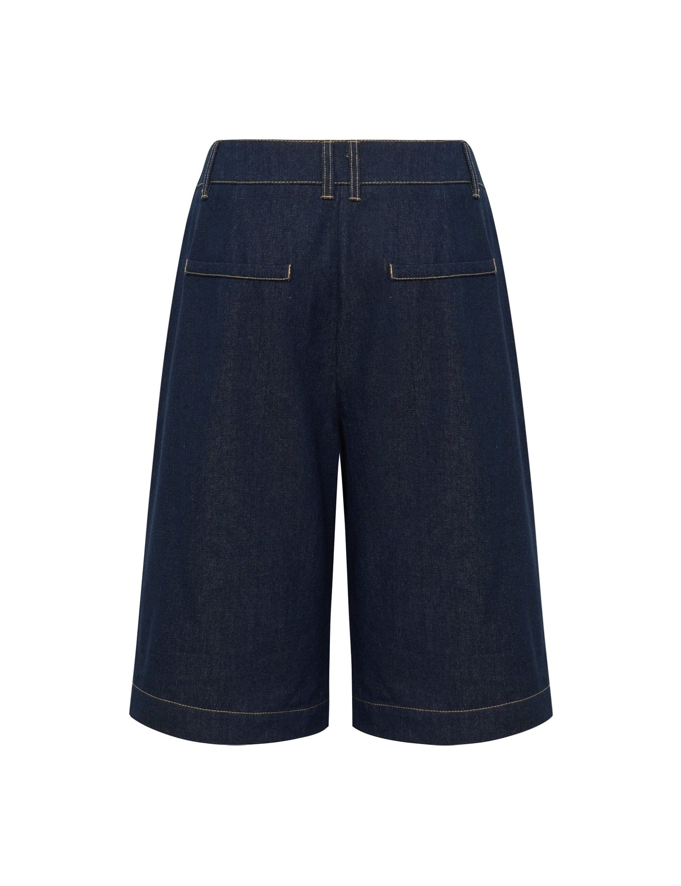Short en denim MbyM en denim bleu foncé non délavé. Le short présente une coupe ample et arrive juste au-dessus des genoux.