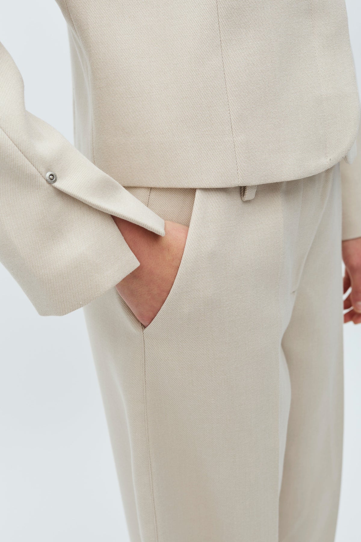 Pantalon ample de MbyM dans une couleur brun chiné. Le pantalon est composé de 70 % de polyester et 30 % de viscose, avec une taille haute et une longueur cheville.