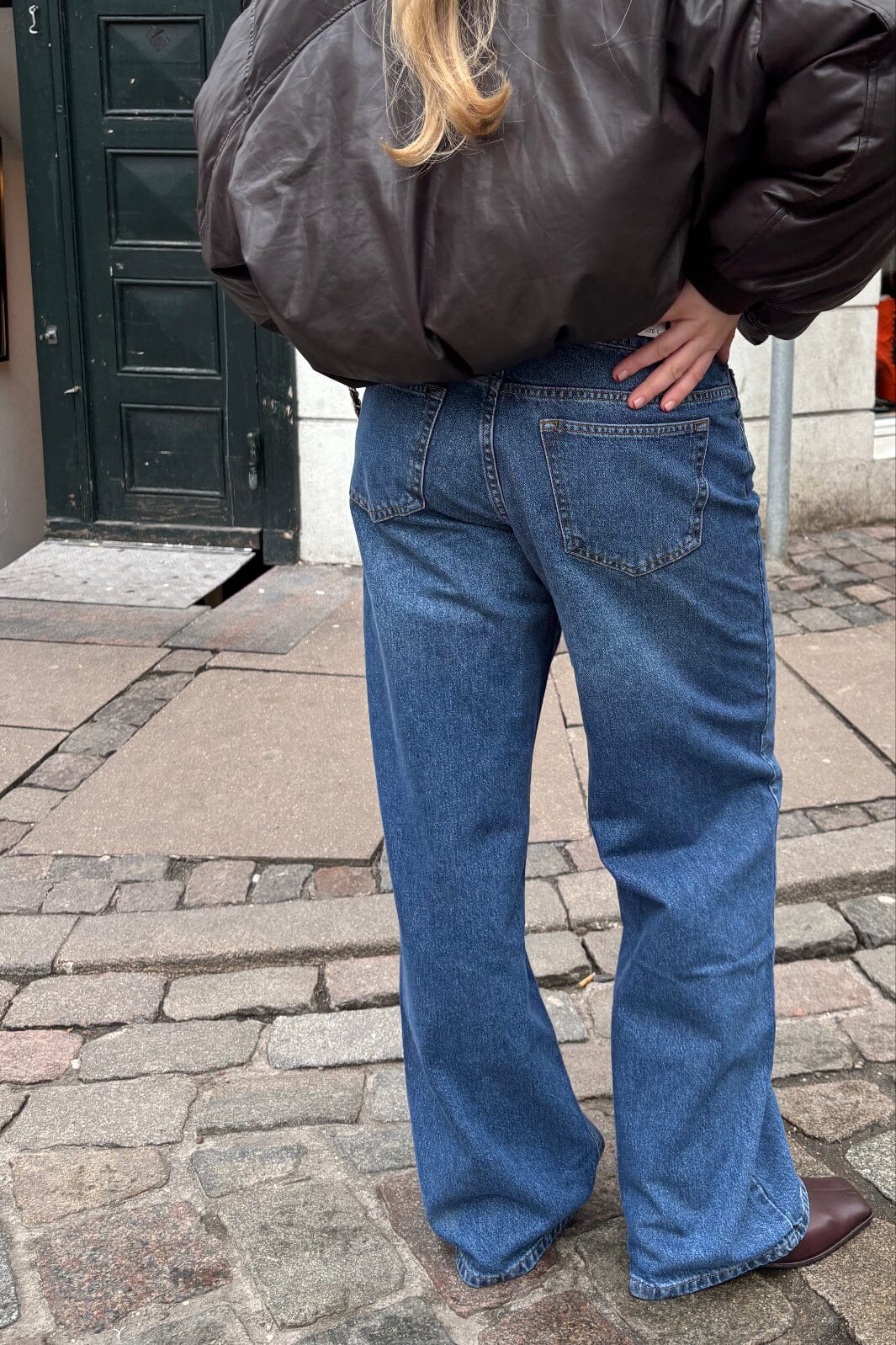 Jean MbyM dans un délavage bleu vintage. Le jean présente une taille haute et une coupe ample.