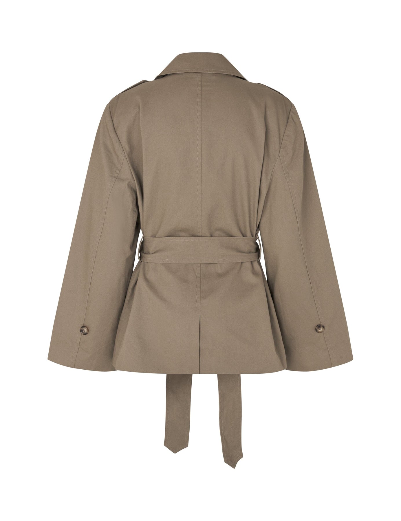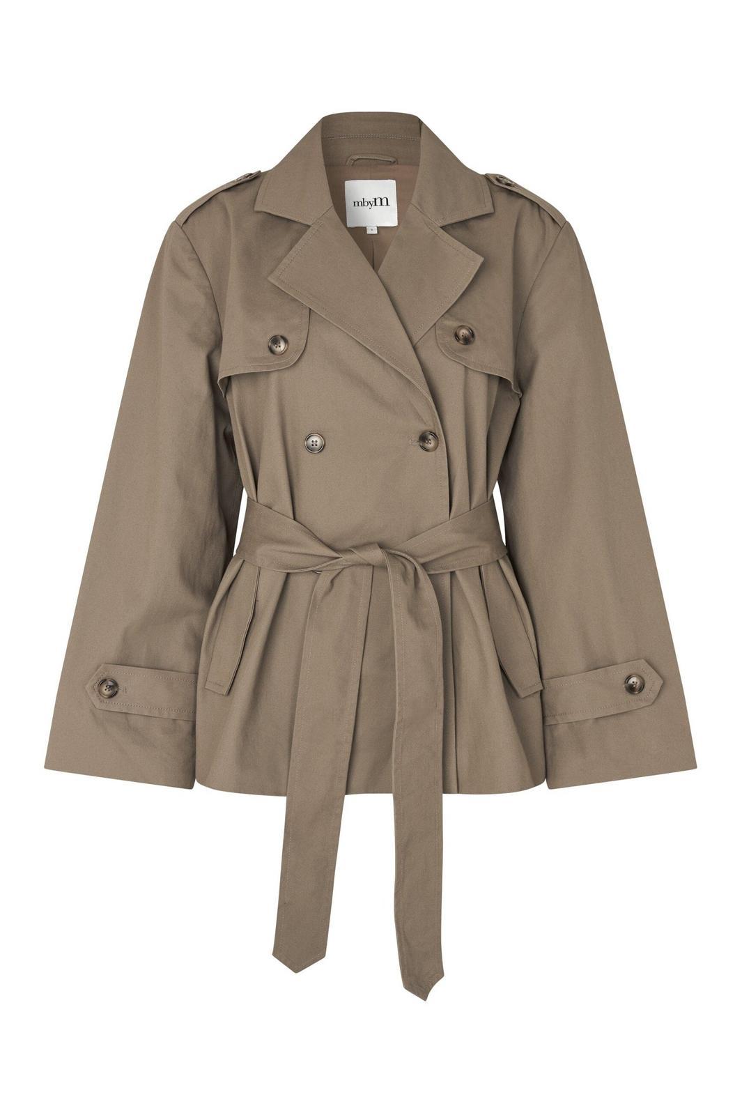 Une veste de MbyM dans une nuance sable. La veste est fabriquée en 100 % coton et possède une fermeture croisée à l’avant avec ceinture à nouer à la taille.