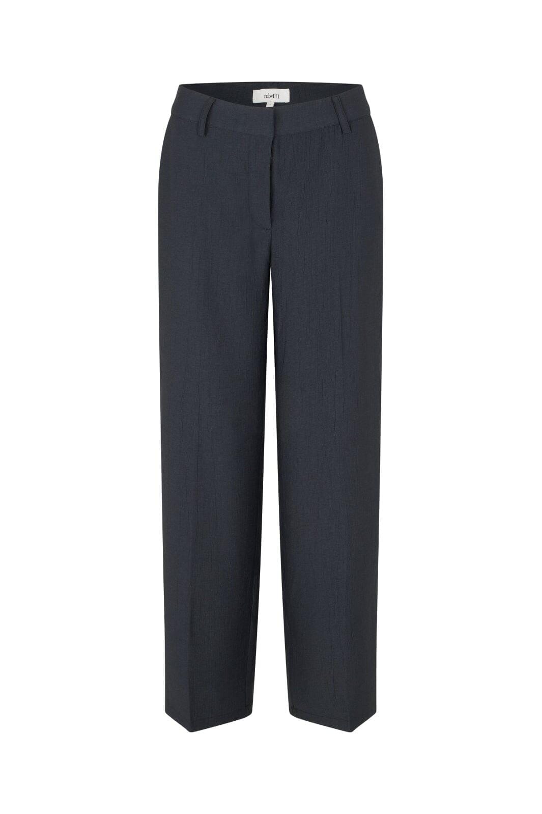 Pantalon MbyM avec motif à rayures tennis dans une nuance bleu-vert foncé. Le pantalon est confectionné dans un mélange de polyester et de viscose.