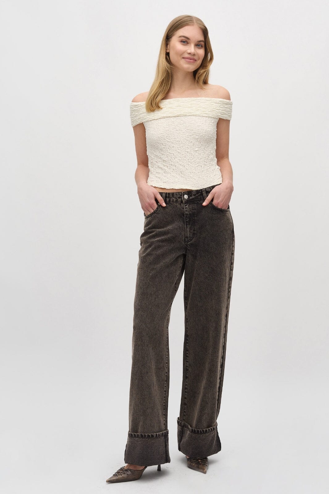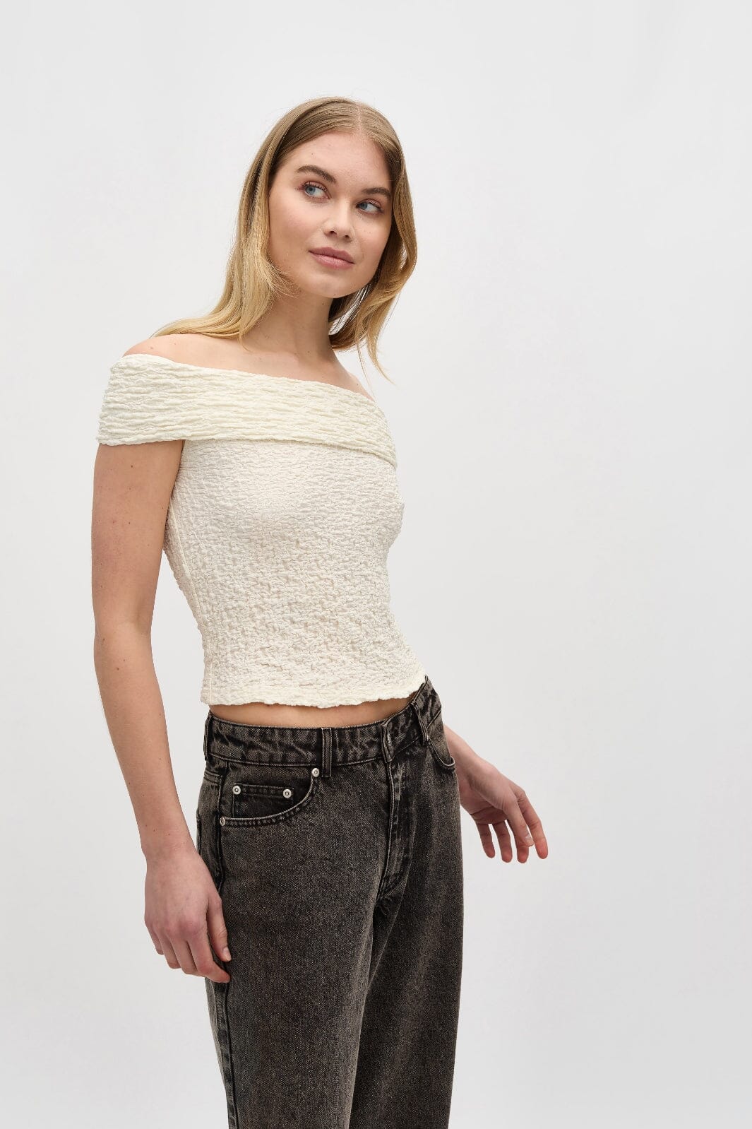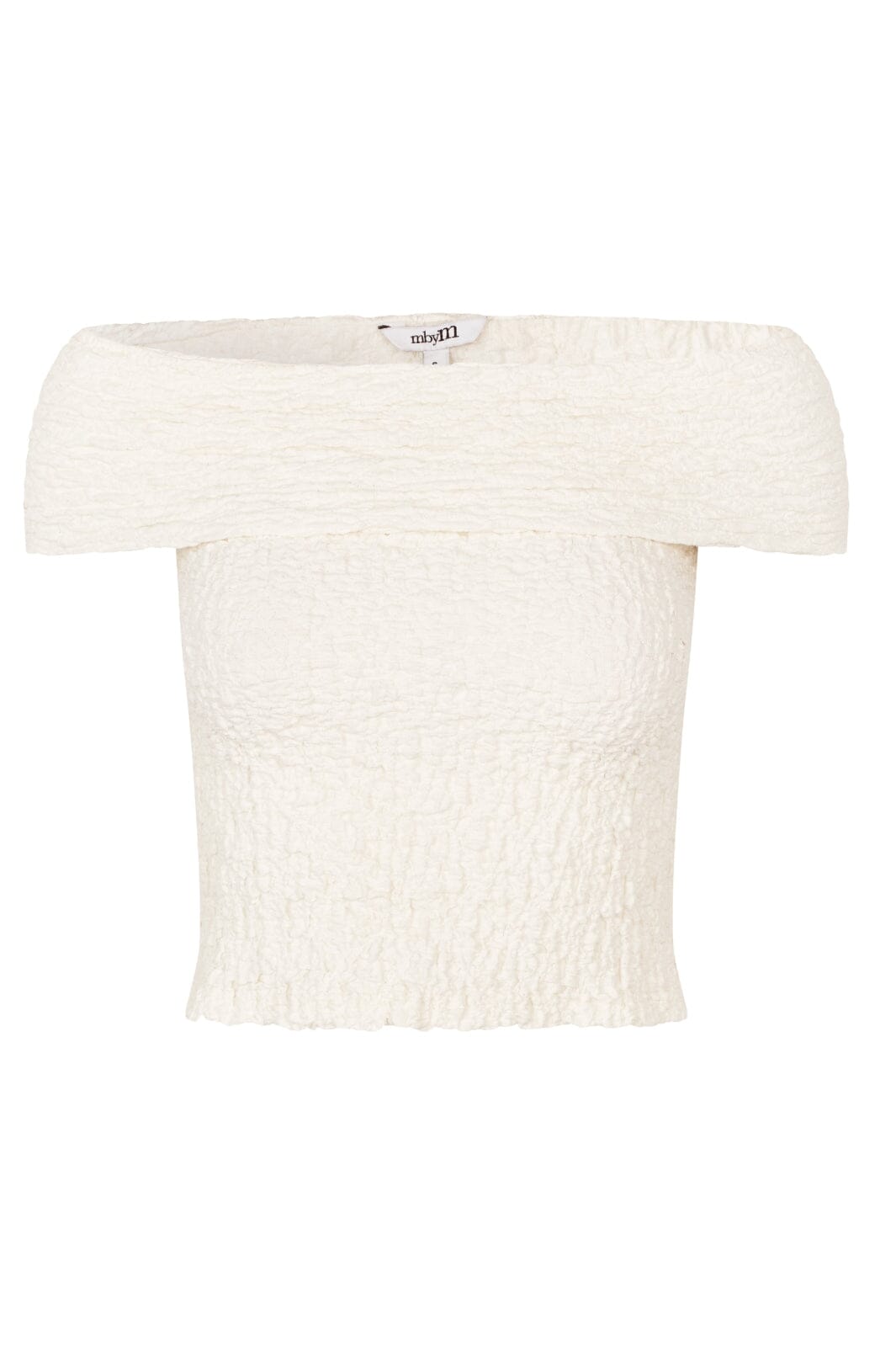 Top off-shoulder de MbyM dans une couleur sucre claire. Le top a une surface texturée et des détails en volants qui lui donnent un caractère unique. Fabriqué dans un mélange de coton, nylon et élasthanne.