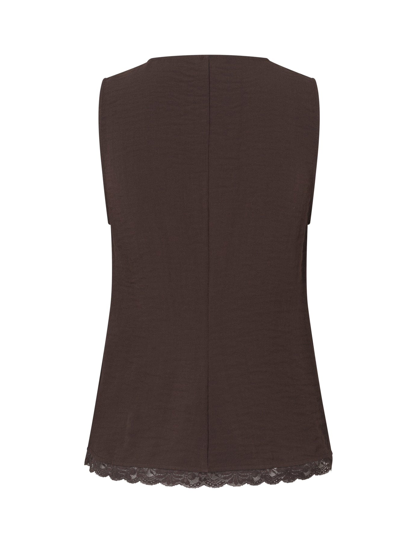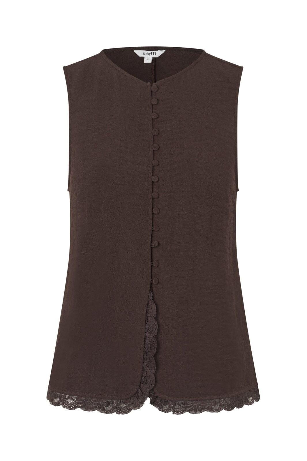 Haut sans manches de MbyM de couleur brun foncé. Le haut possède une encolure ronde et une fermeture boutonnée sur le devant avec des boutons recouverts de tissu.