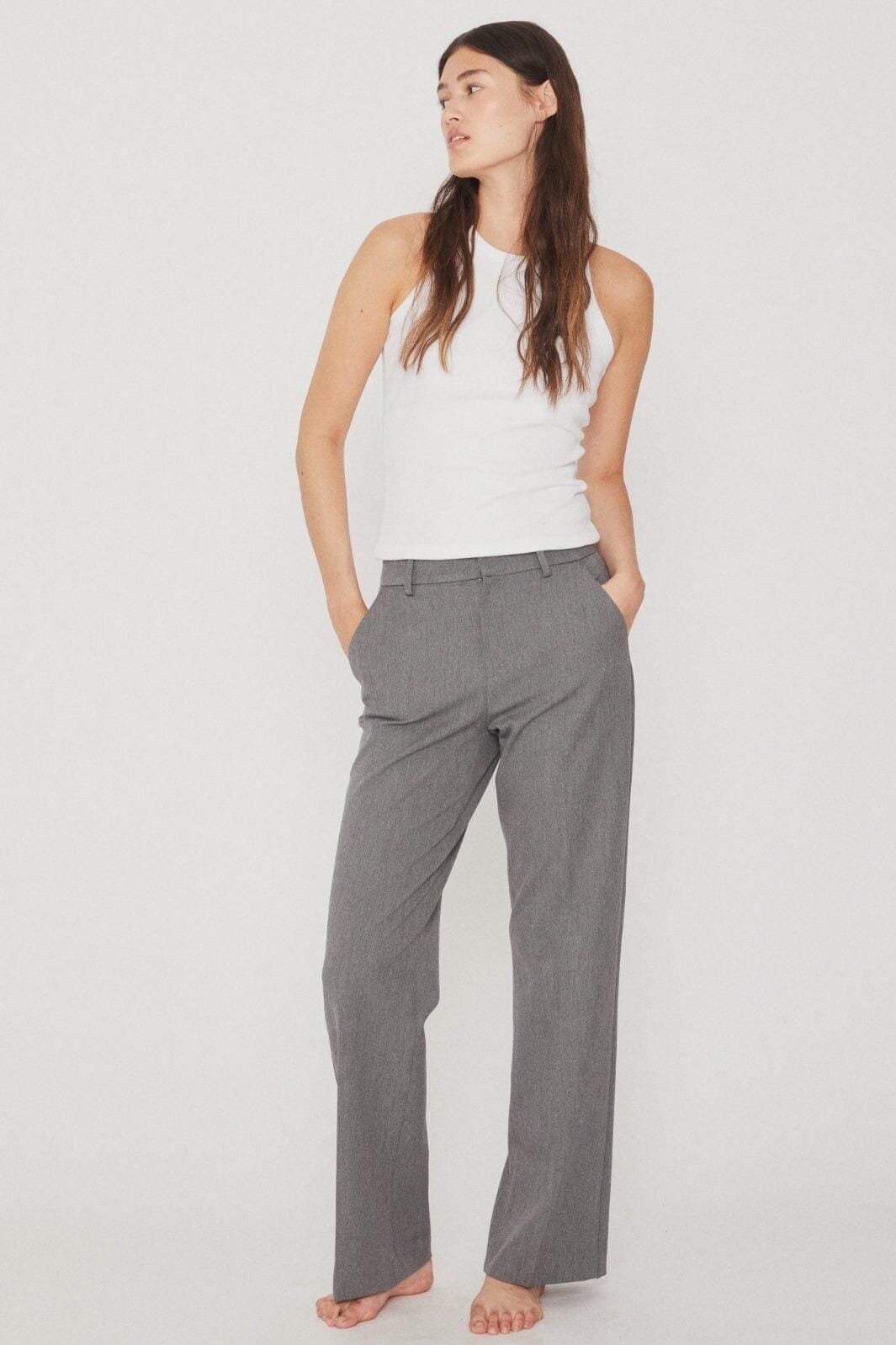 Pantalons gris de MbyM en tissu mélangé. Les pantalons ont une coupe droite et une longueur cheville avec des poches avant. Le tissu a une structure mélangée neutre.