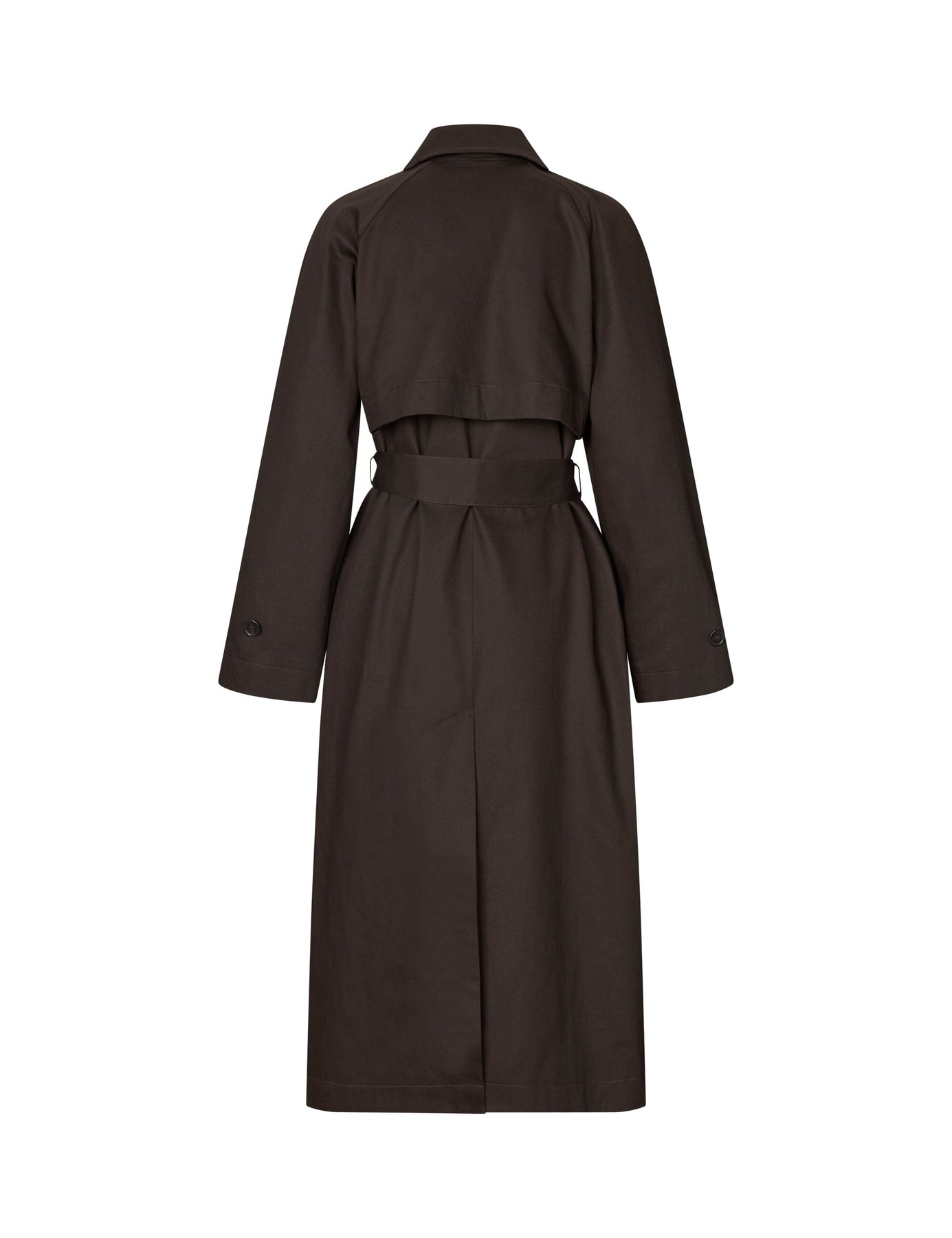 Trench-coat de MbyM, confectionné en 100 % coton dans une nuance brun foncé. Le manteau présente une coupe croisée à double boutonnage avec ceinture à nouer à la taille.