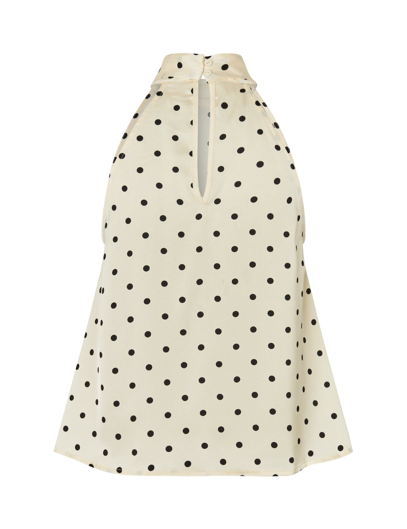 Top sans manches de MbyM, couleur crème à pois noirs. Le top présente une coupe ample et des liens à nouer au niveau du col.