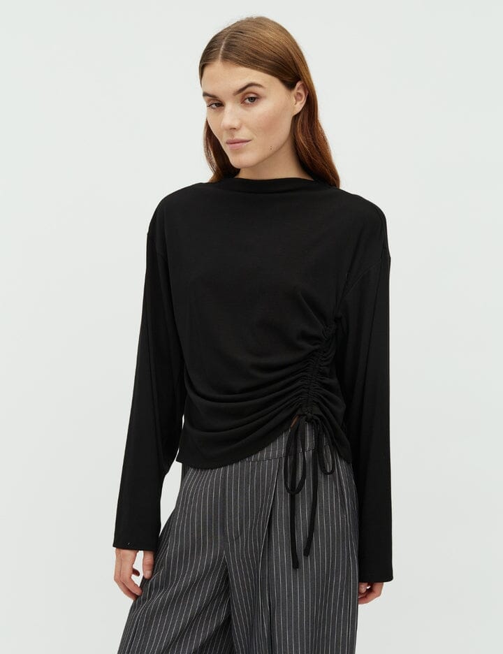 Haut noir de MbyM à manches longues et col montant. Le haut possède un lien à nouer sur le côté et des détails à volants.